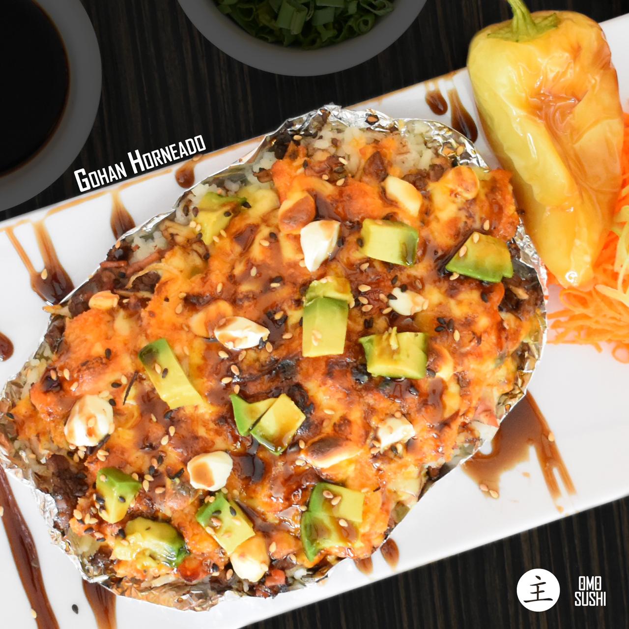 Arroz blanco con Philadelphia, cangrejo, res y pollo, adornado con aguacate, Philadelphia, ajonjolí, salsa de anguila y queso gratinado.