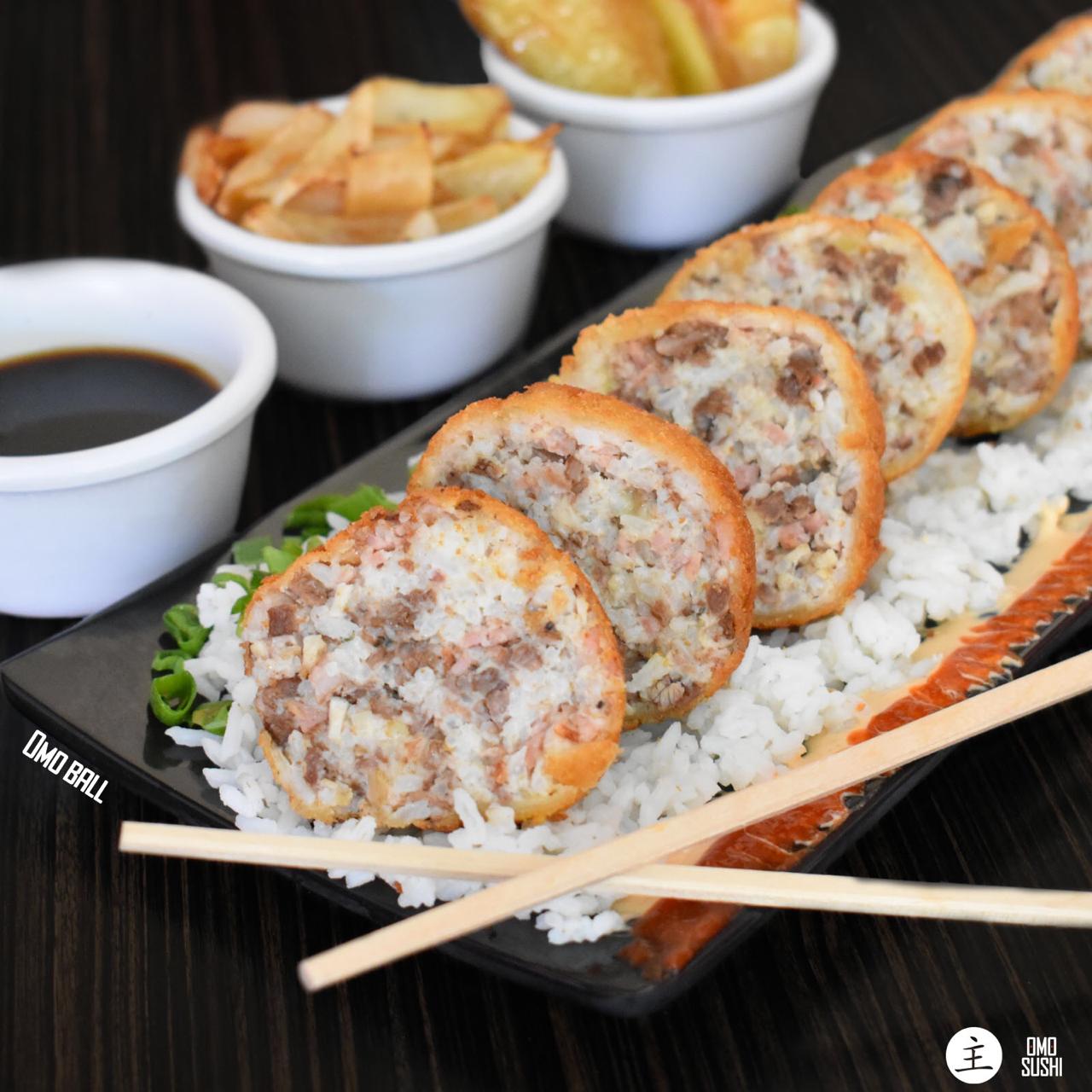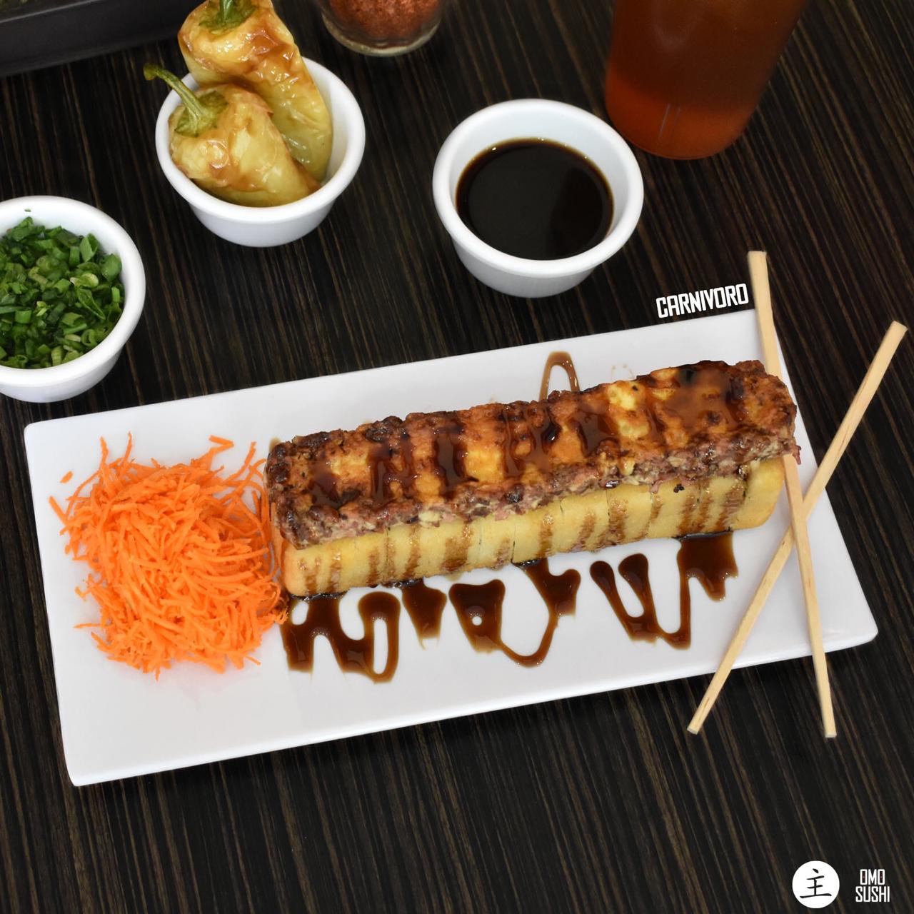 Por dentro Philadelphia, aguacate, pepino, res, pollo y tocino. Por fuera un topping de res, tocino, Philadelphia y queso Chihuahua, horneado con chipotle, bañado en salsa de anguila.