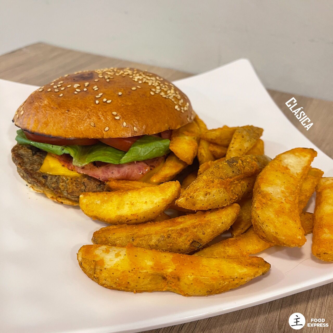 Hamburguesa clásica de res con queso americano, tomate y lechuga.