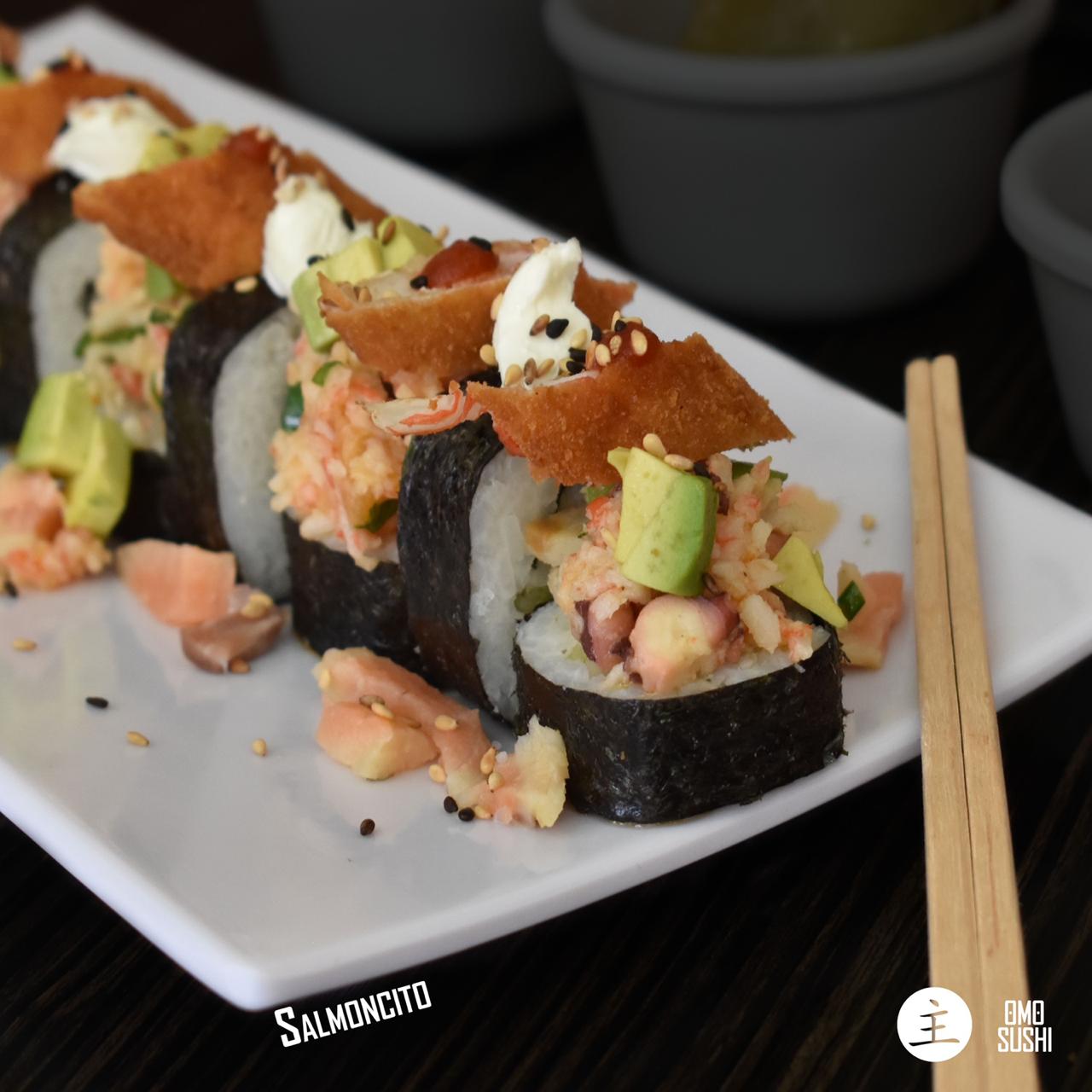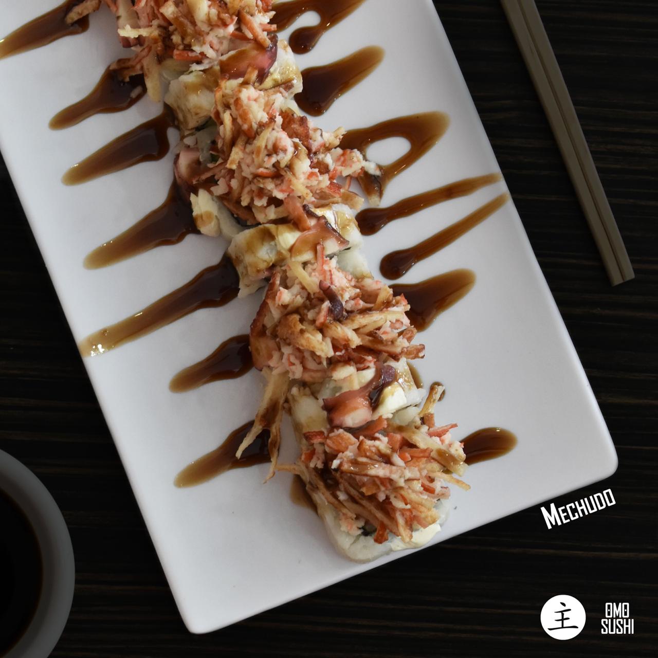 Rollo de alga por fuera, relleno de pepino, Philadelphia y aguacate. Por fuera camarón, salmón, Philadelphia, con topping horneado de pulpo y camarón spicy, coronado con trocitos de kanikama empanizado, aguacate, Philadelphia y Sriracha.