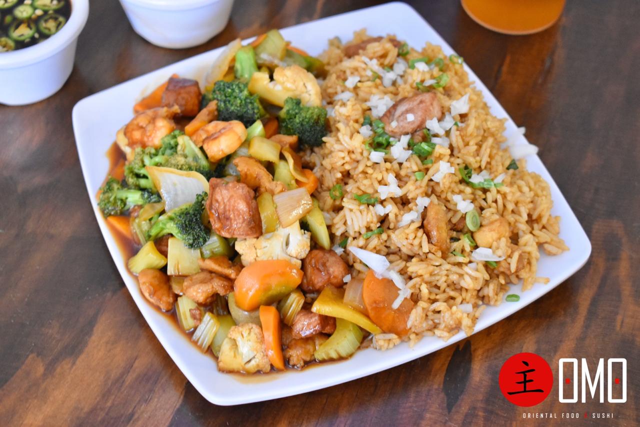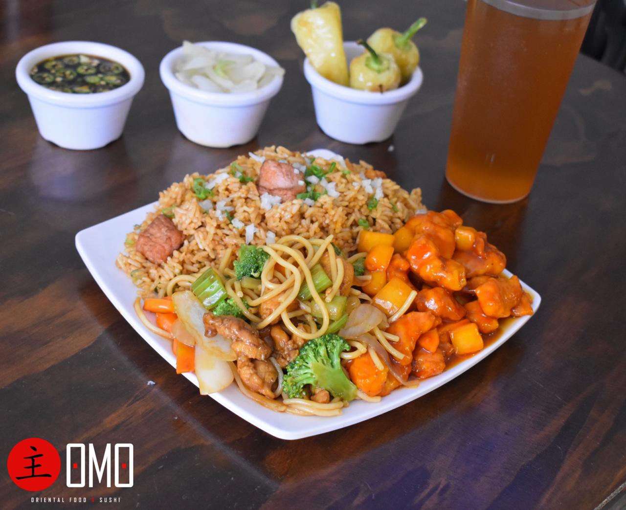 1/2 rollo de sushi a elegir (3 quesos, mar y tierra, guamuchilito natural o guamuchilito y empanizado), guiso a elegir + arroz frito + 1/2 litro de té.
