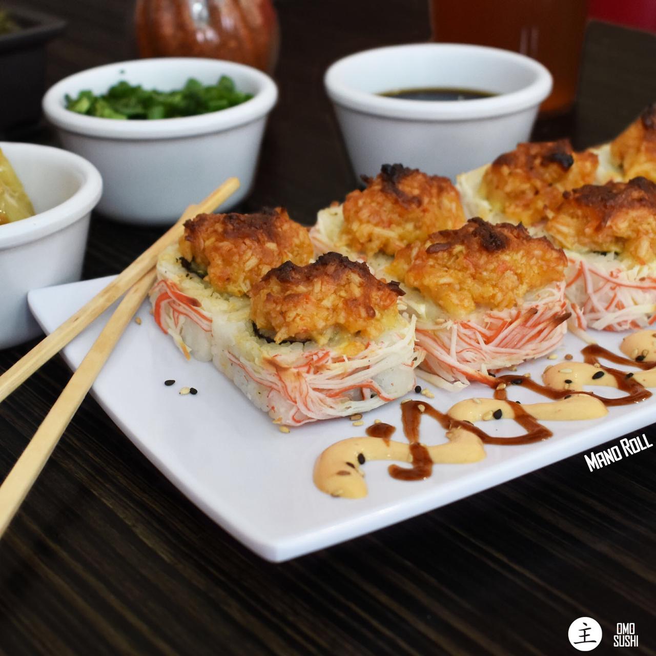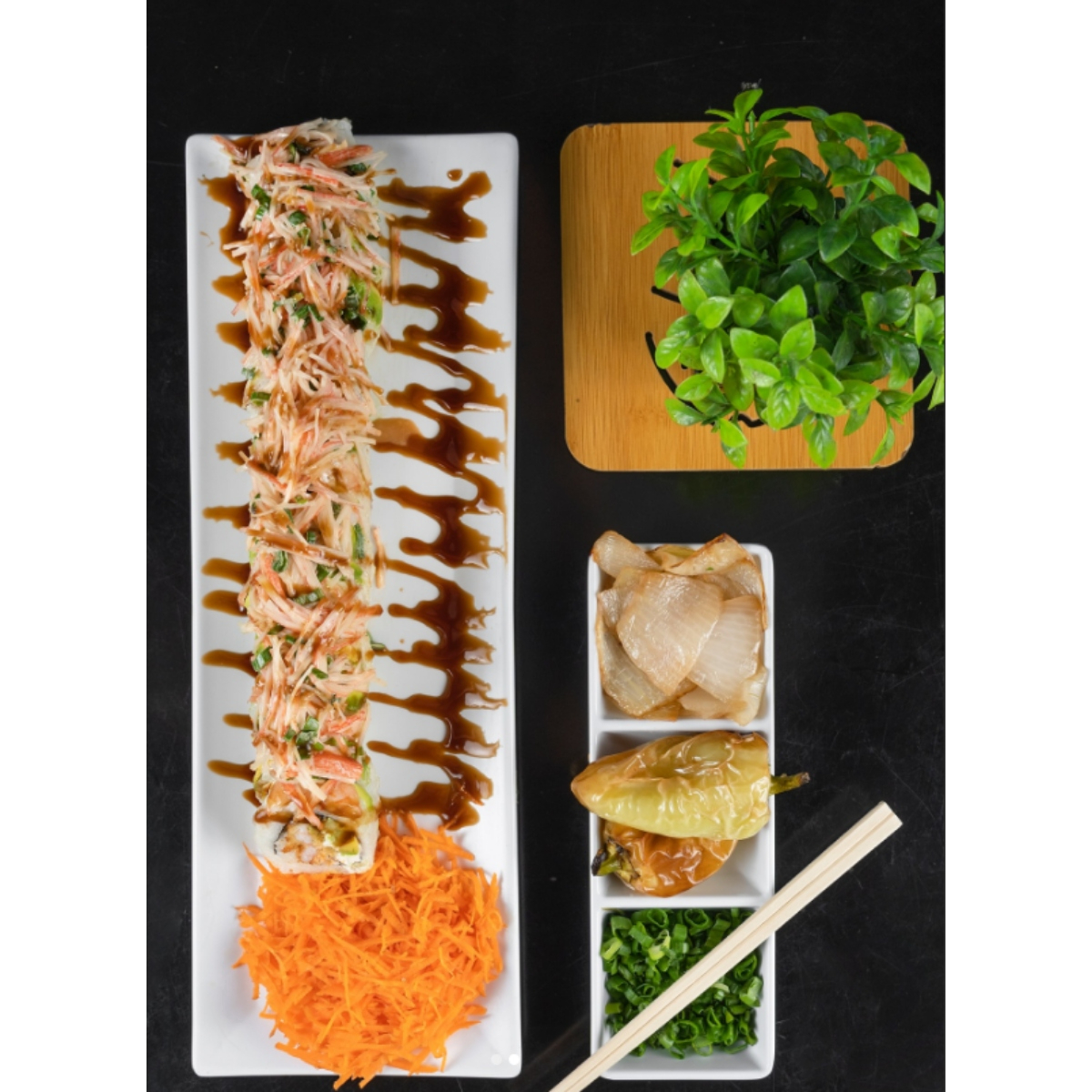 Por dentro Philadelphia, aguacate, pepino y cangrejo empanizado. Por fuera forrado con ajonjolí, Philadelphia y aguacate acompañado de un topping de cangrejo, camarón bañado de shichimi con salsa tipo soya aguachile.