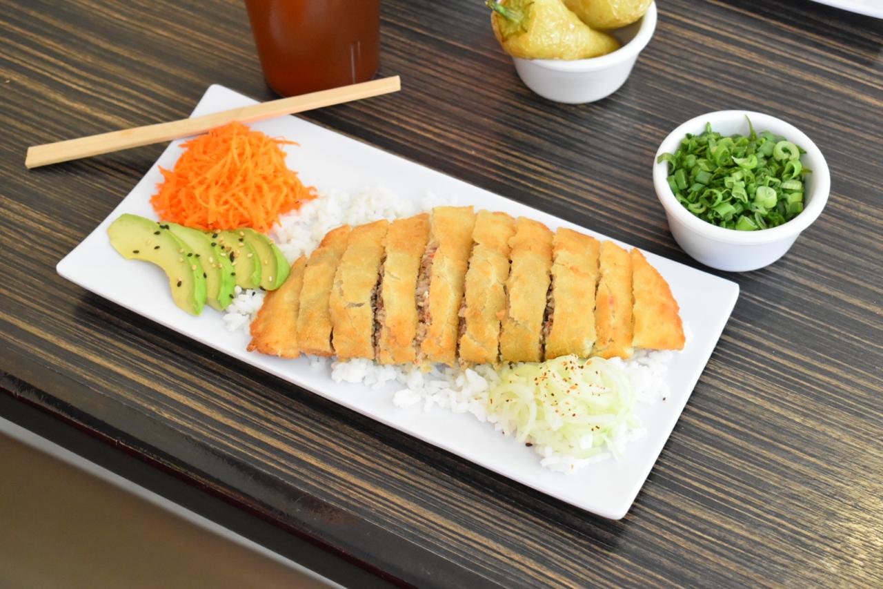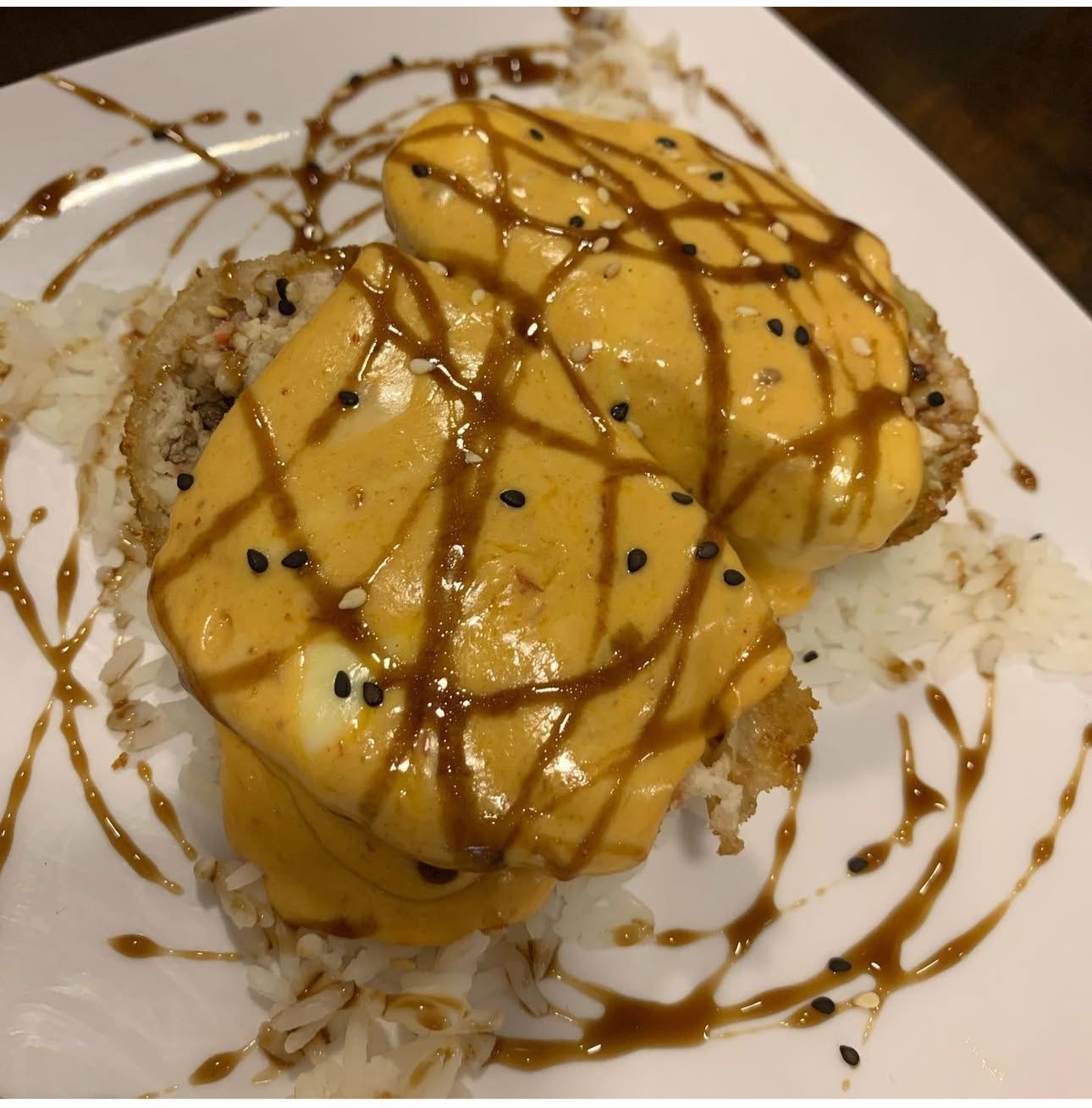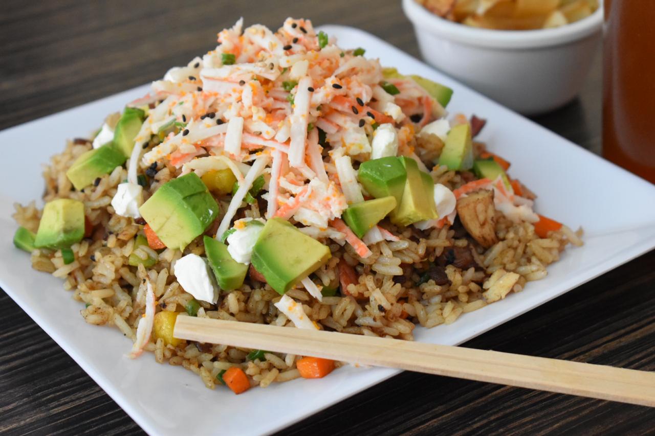 Arroz frito con calabaza, zanahoria, pollo, res, camarón, coronado con aguacate, Philadelphia, camarones empanizados y topping de ensalada kani.