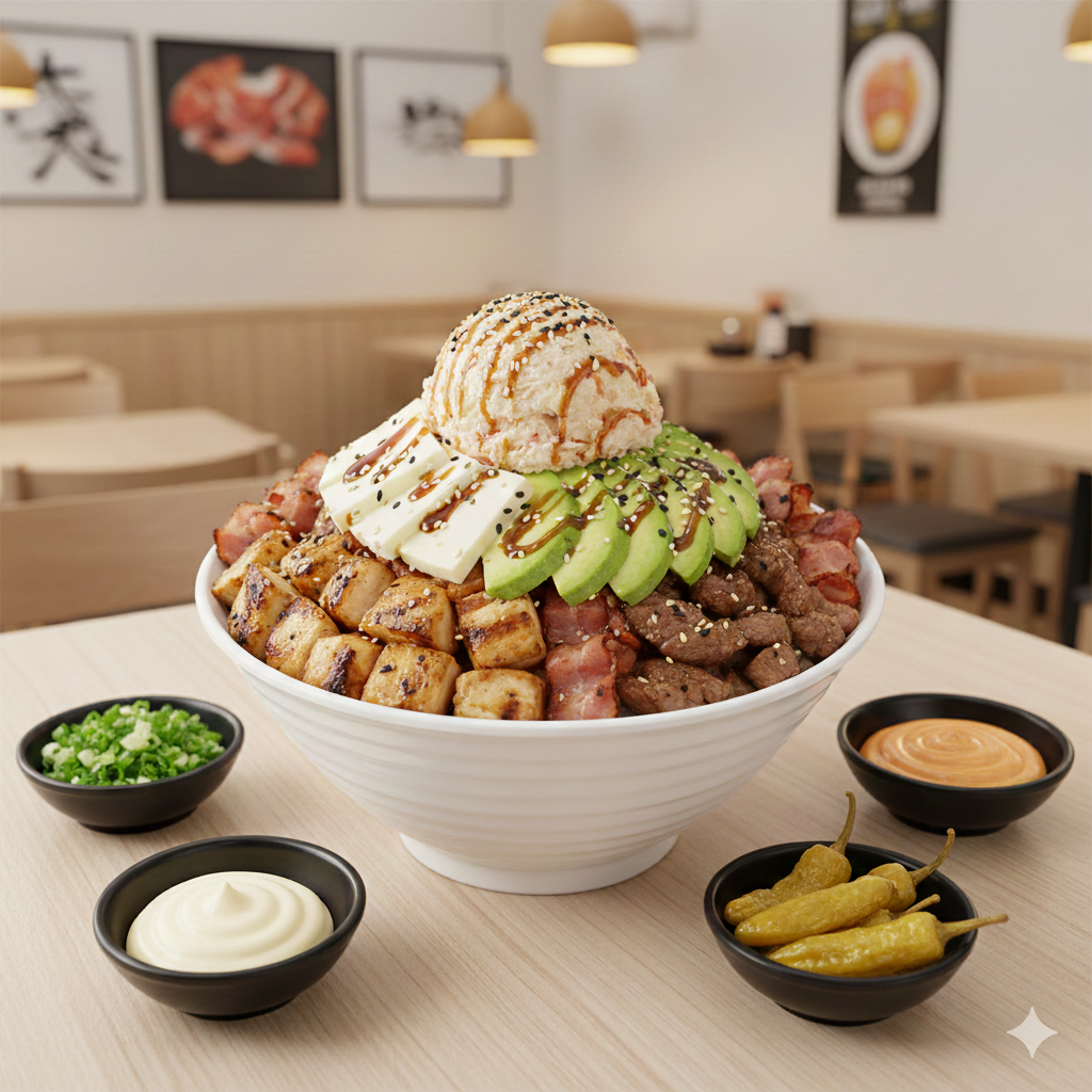Arroz blanco acompañado de res, pollo y tocino. Adornado con Tampico, Philadelphia y aguacate, bañado en salsa de anguila y ajonjolí.