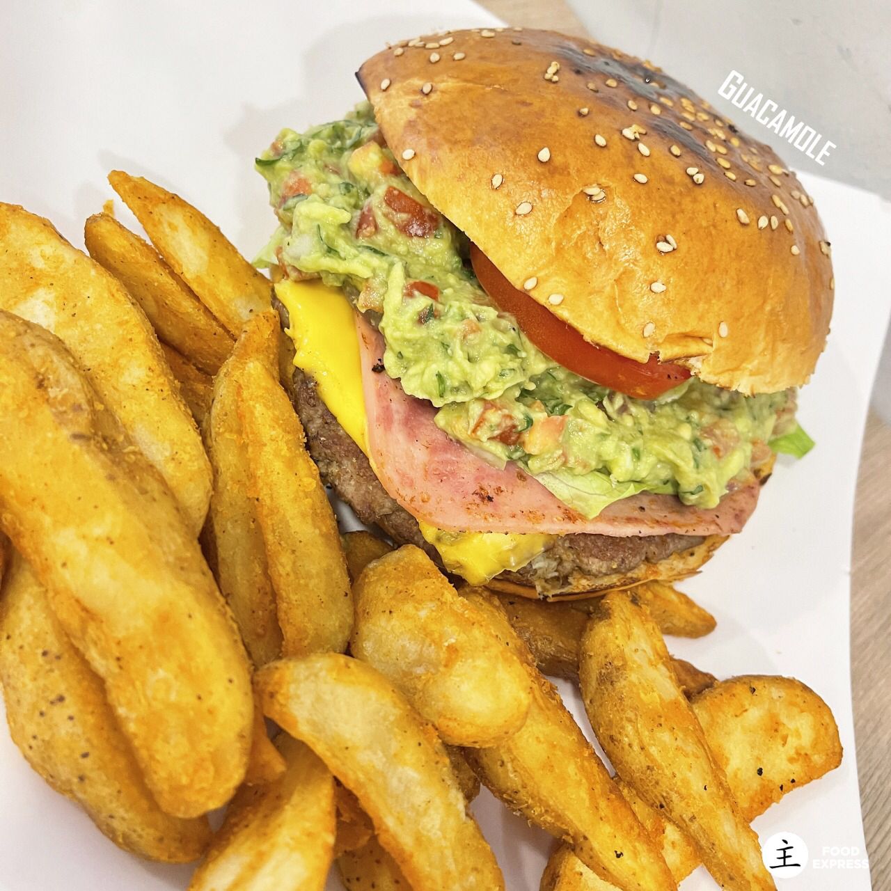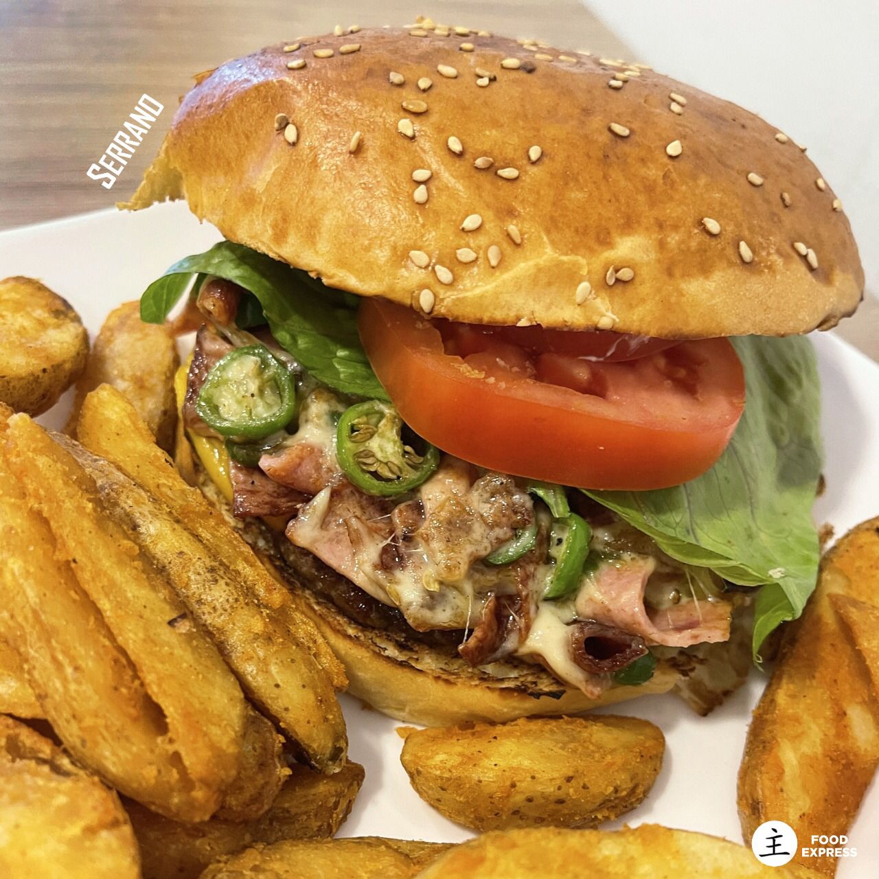 Hamburguesa de res con queso americano, queso Chihuahua, tocino, chile en rodajas, lechuga y tomate.
