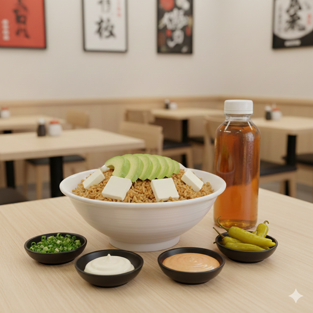 Arroz frito acompañado de aguacate, Philadelphia y 1/2 Litro de té.