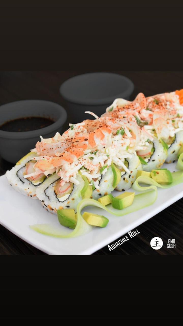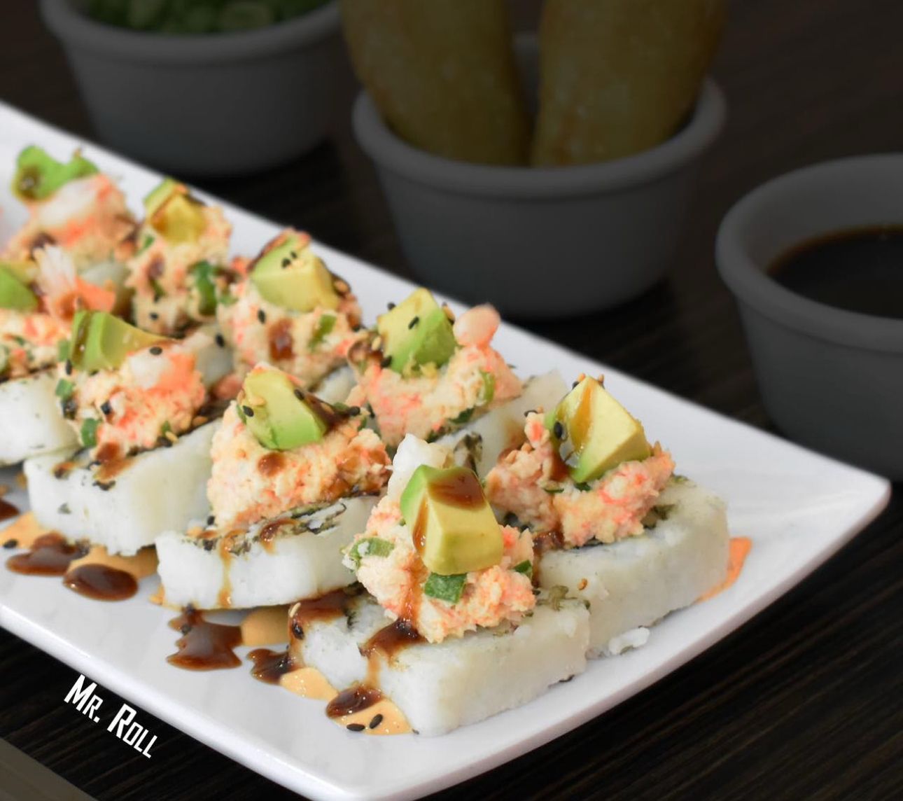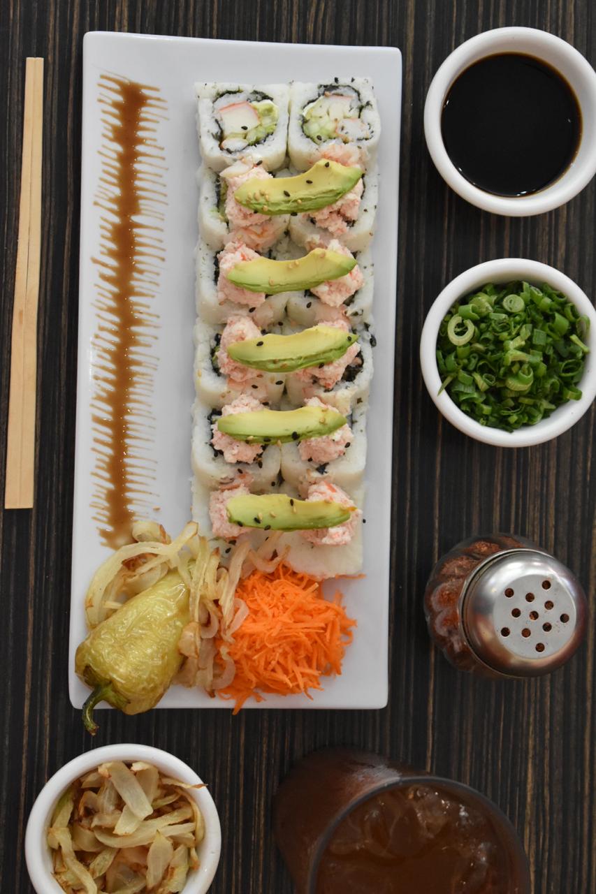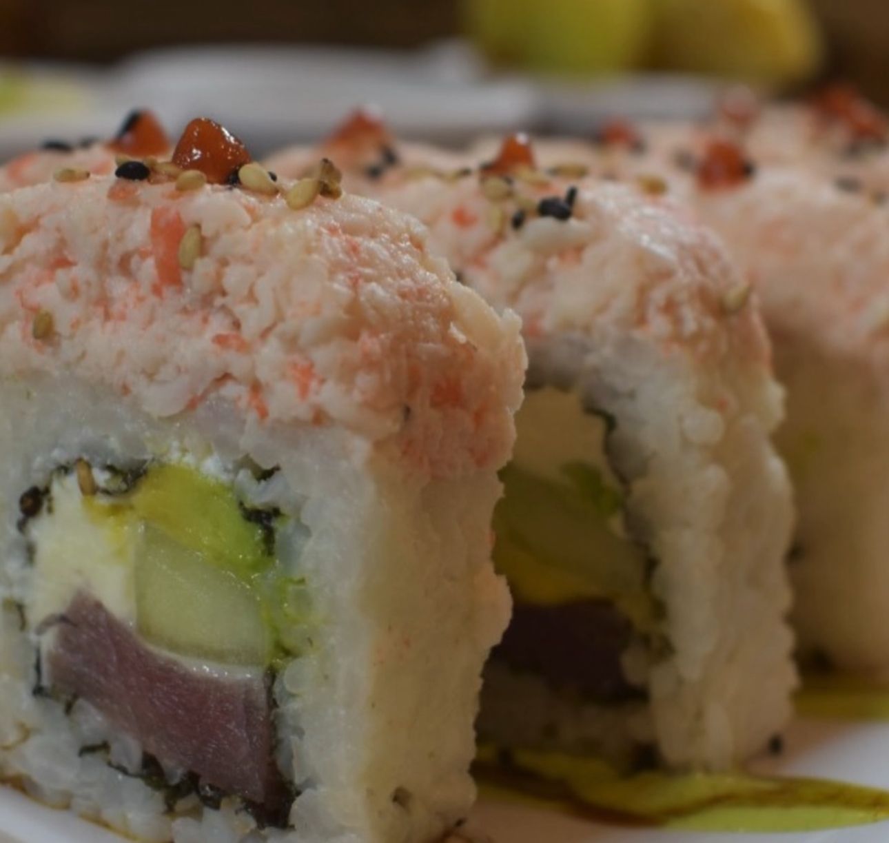 Por dentro Philadelphia, aguacate, pepino y cangrejo. Por fuera topping de camarón adornado con aguacate, ajonjolí y una salsa agripicosa.