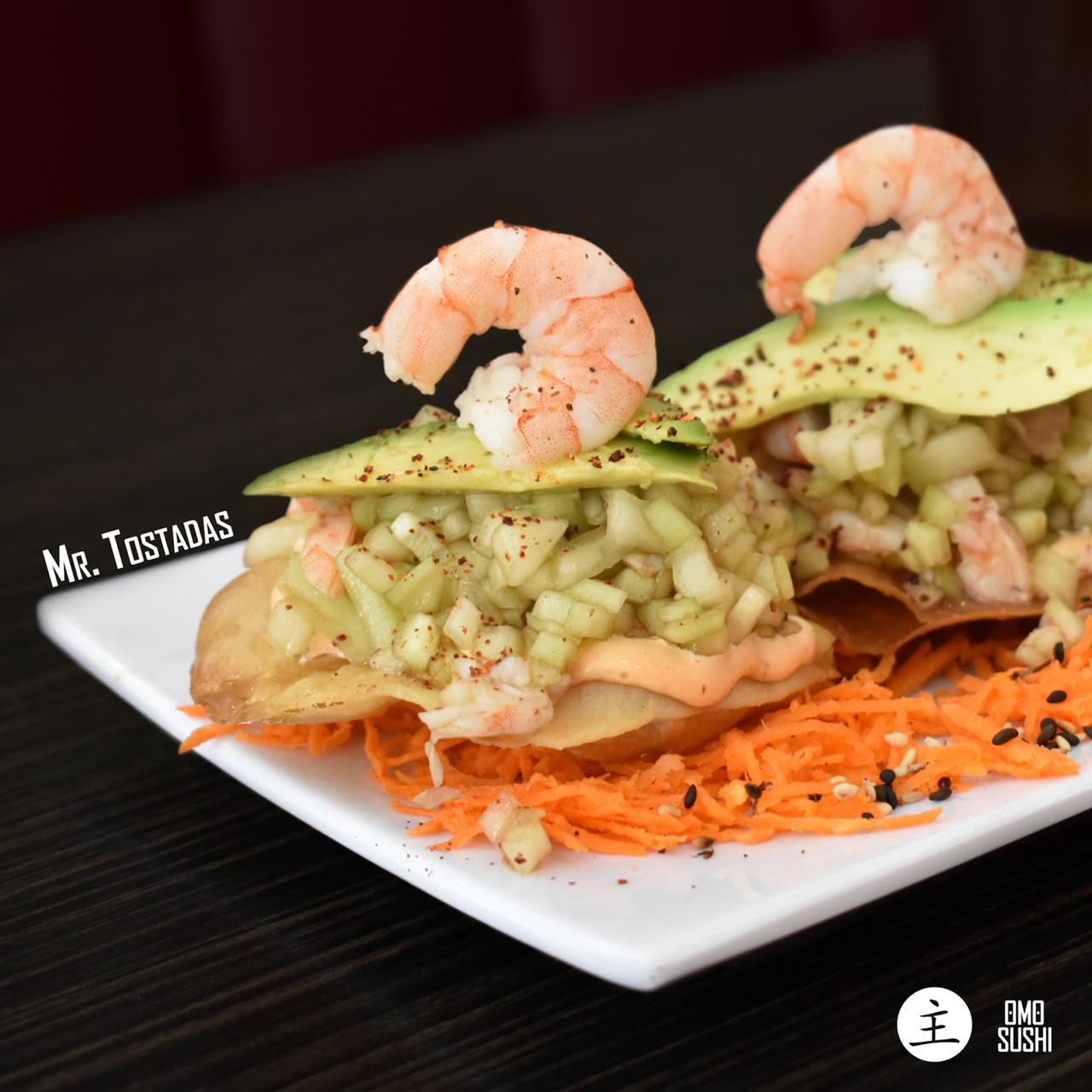 Por dentro Philadelphia, aguacate, pepino y camarón. Por fuera forrado de pulpo con un spicy de kanikama frito adornado con camarón empanizado, bañado en salsa de anguila y ajonjolí.