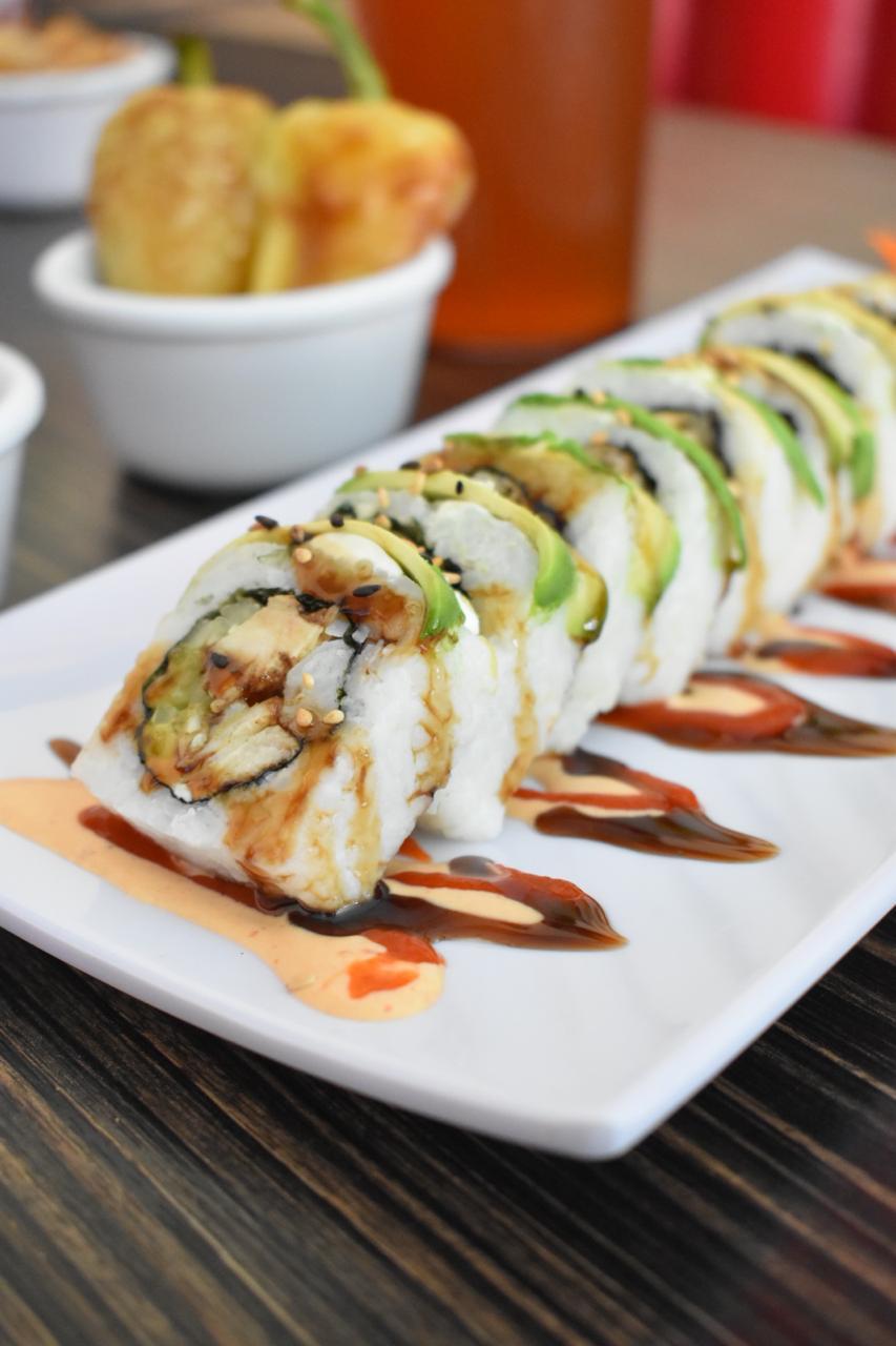 Por dentro Philadelphia, aguacate, pepino y camarón. Por fuera avocado acompañado con topping picosito coronado de camarón empanizado y un toque de Sriracha, bañado en salsa de anguila.