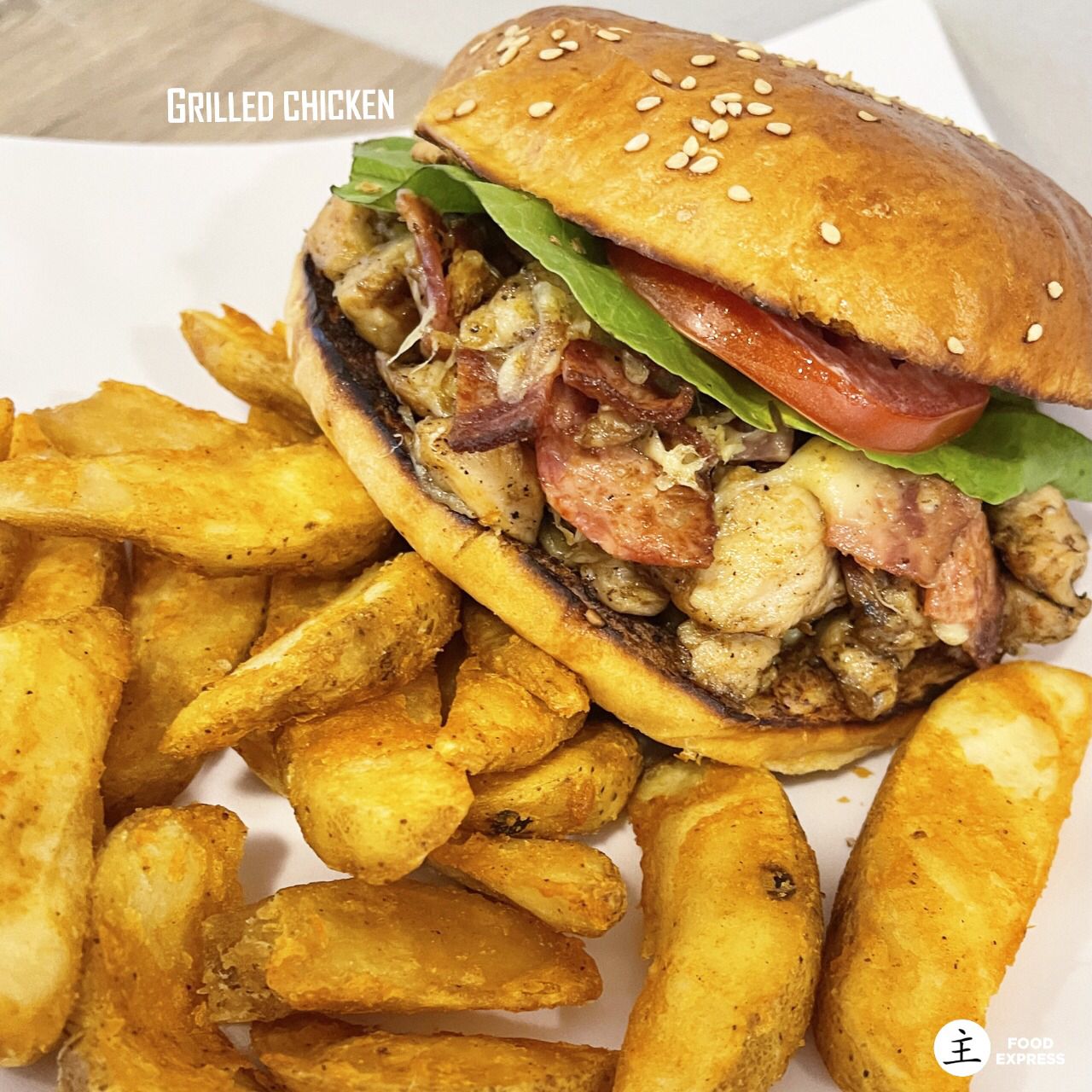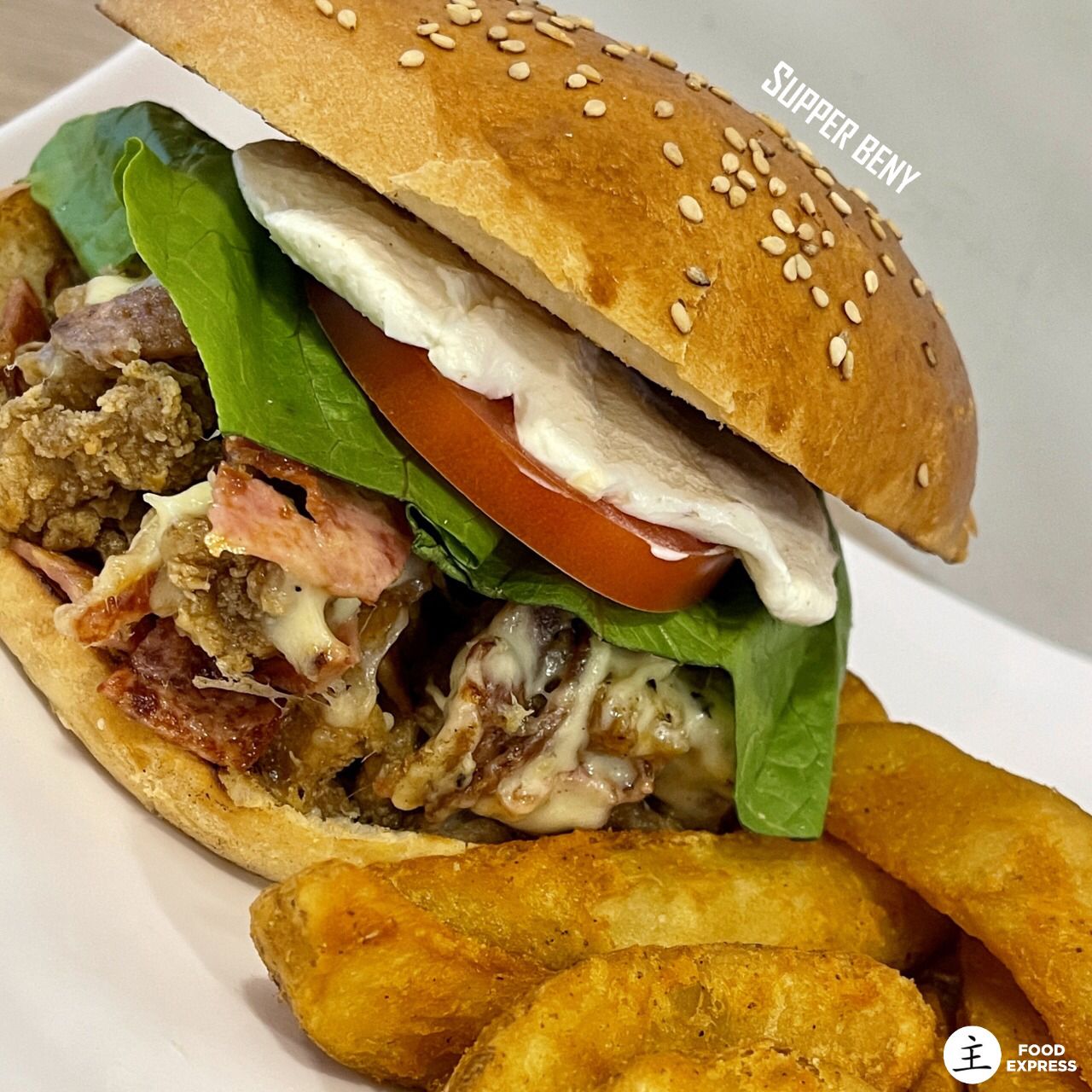 Hamburguesa de pollo empanizado en harina, tocino, queso Chihuahua, Philadelphia, tomate y lechuga.