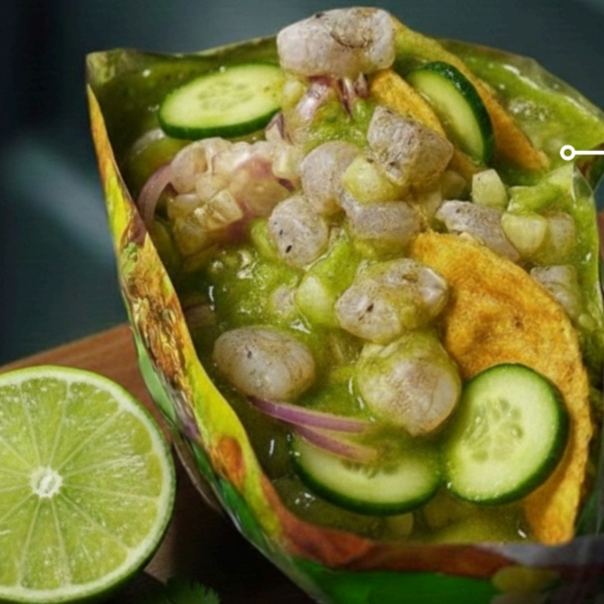 Tostitos Verdes con ceviche a compañados de nuestra salsa de la casa