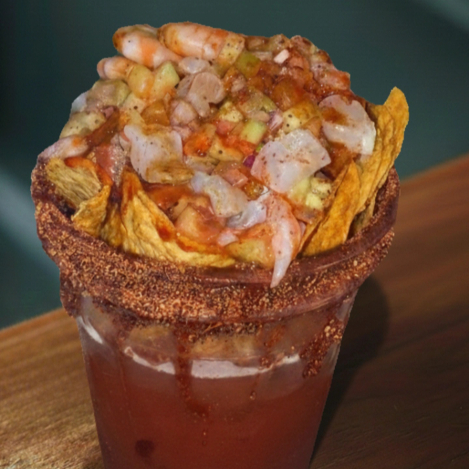 Delicioso Clamato 500 ml, acompañado de cevichey tostitos