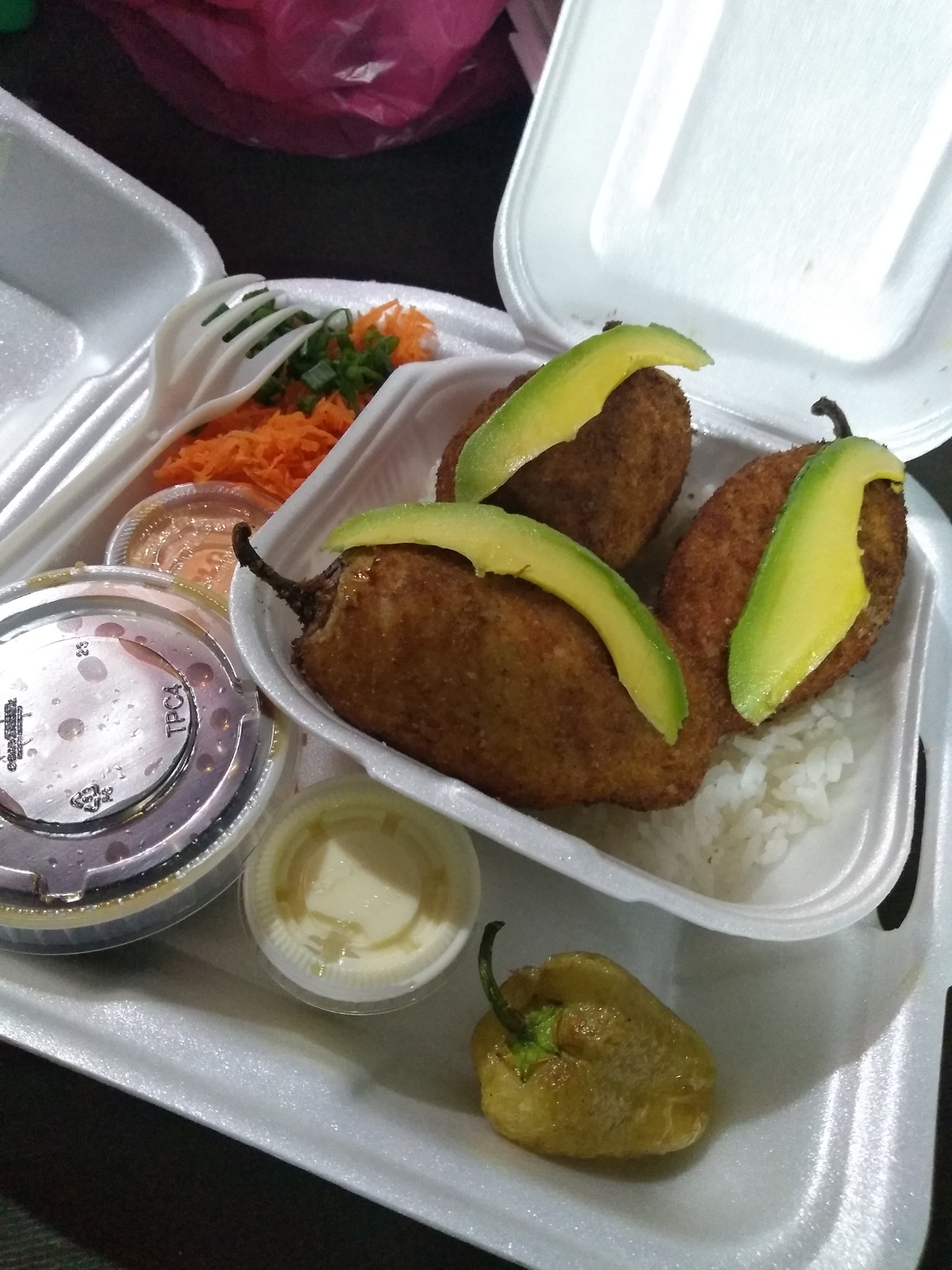 Chiles caribe rellenos de res, pollo, tampico, chihuahua, philadelphia y una cama de zanahoria.