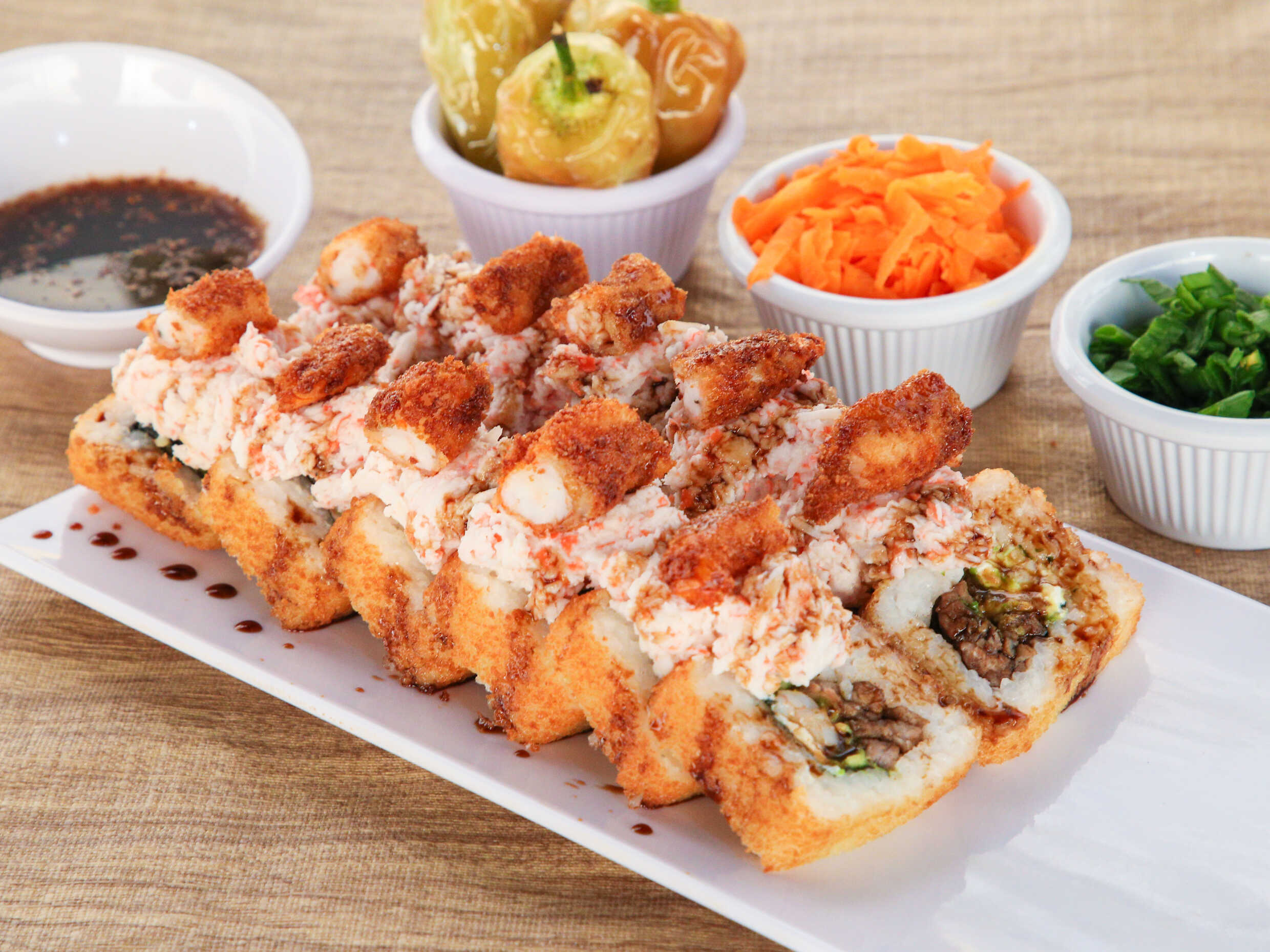 Por dentro, philadelphia, aguacate, pollo y camarón, por fuera, tampico y camarón empanizado bañado en anguila.