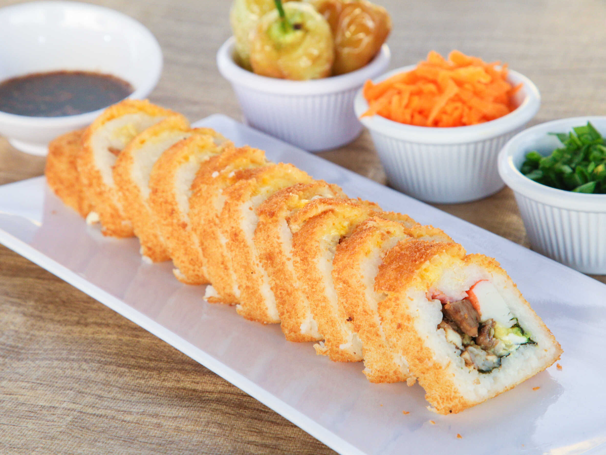 Por dentro philadelphia, aguacate, res, pollo, surimi, tocino y camarón, por fuera los 3 quesos.
