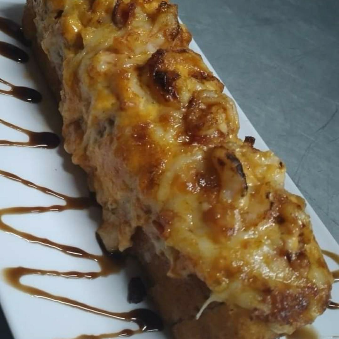 Dentro philadelphia y aguacate res y camarón fuera, toppin de queso tocino serrano camarón y aderezo chipotle.