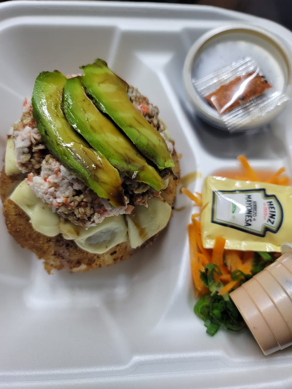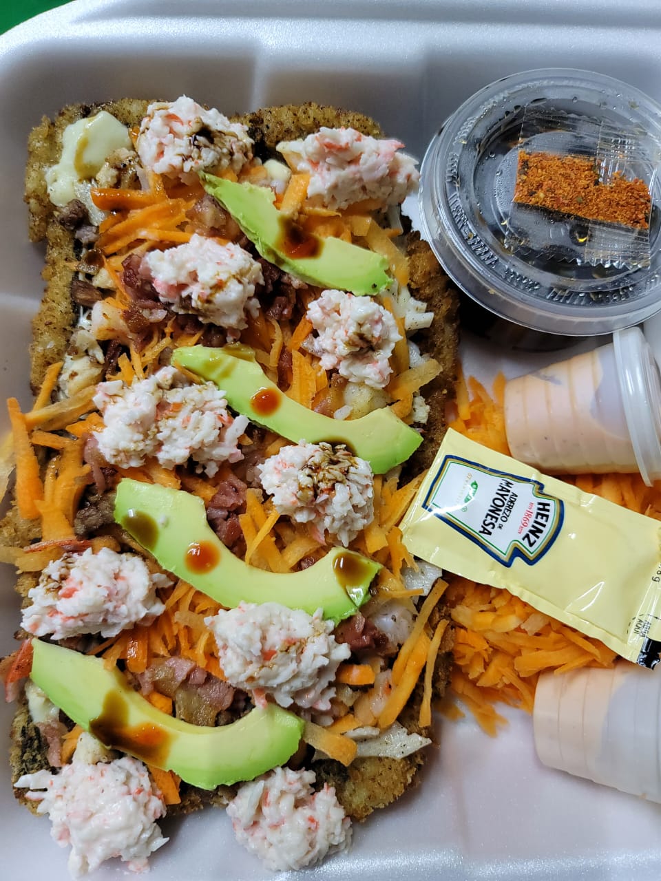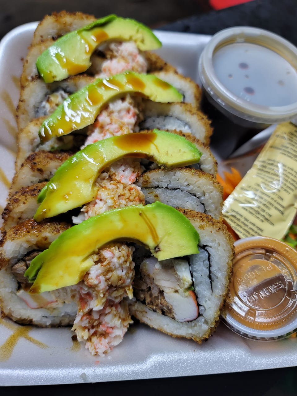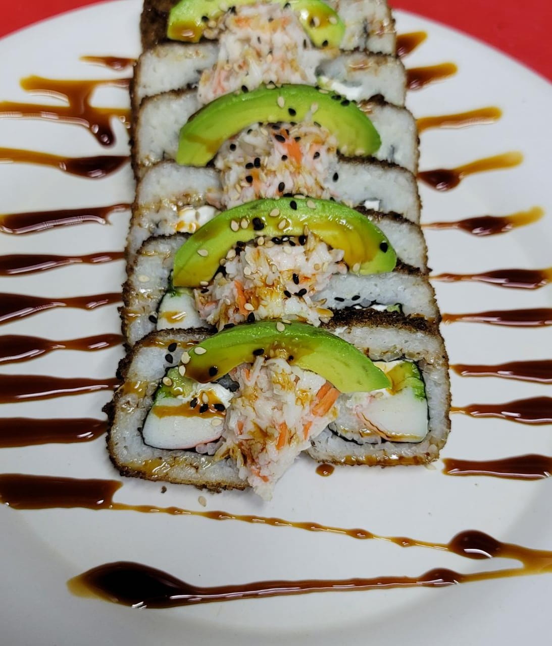 Cangrejo por dentro, tampico, aguacate y salsa de anguila por fuera.