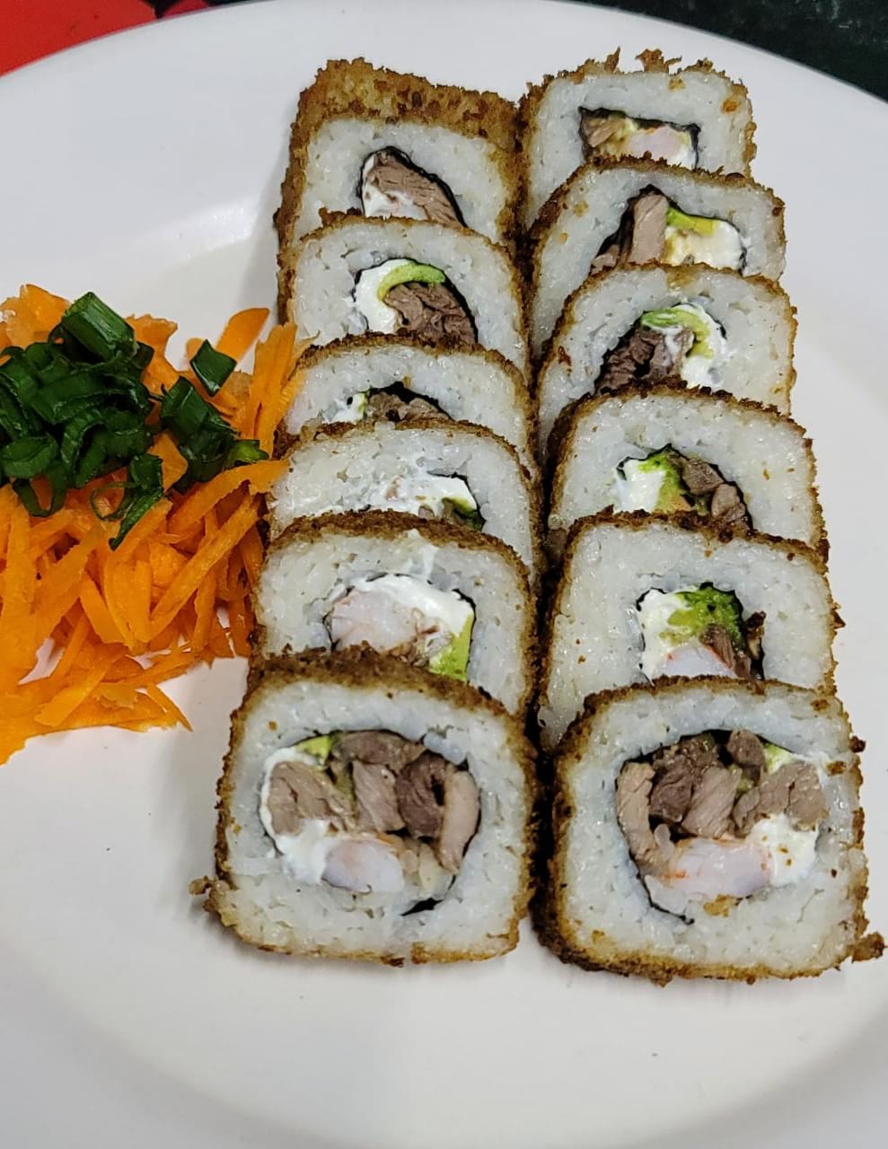 Por dentro: Res, camarón, pollo y cangrejo y por fuera: tampico y aguacate.