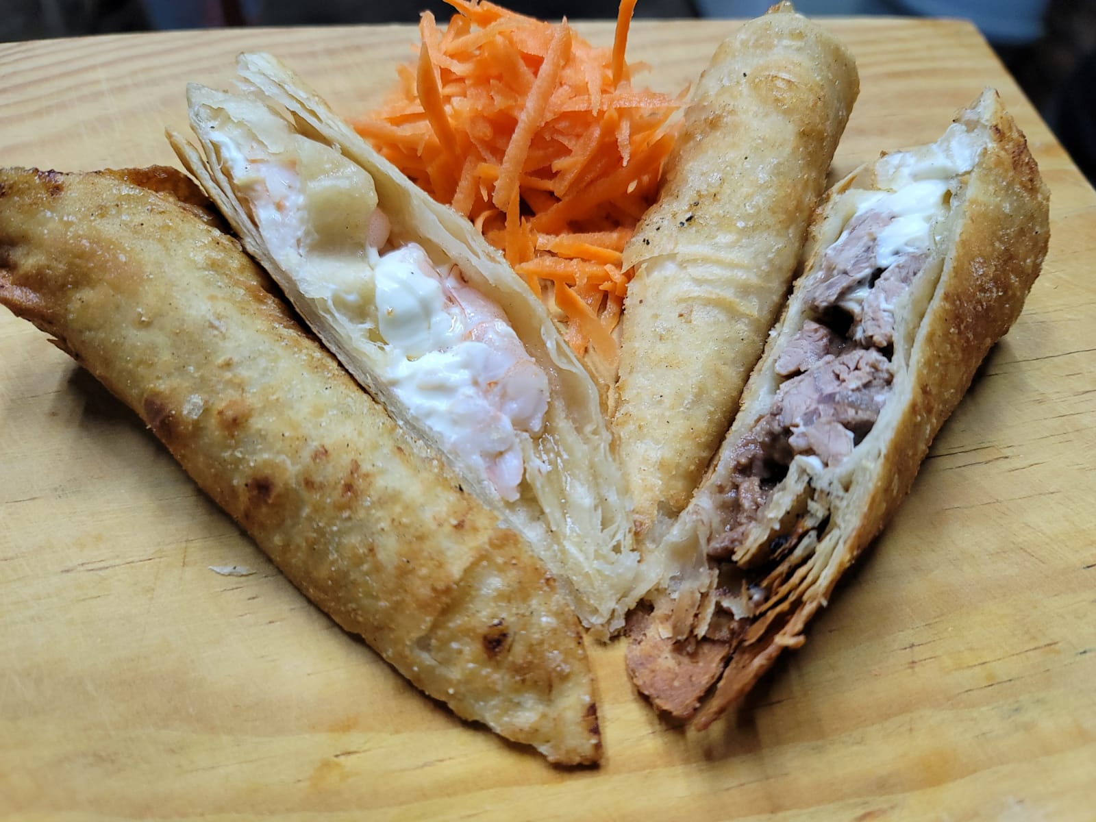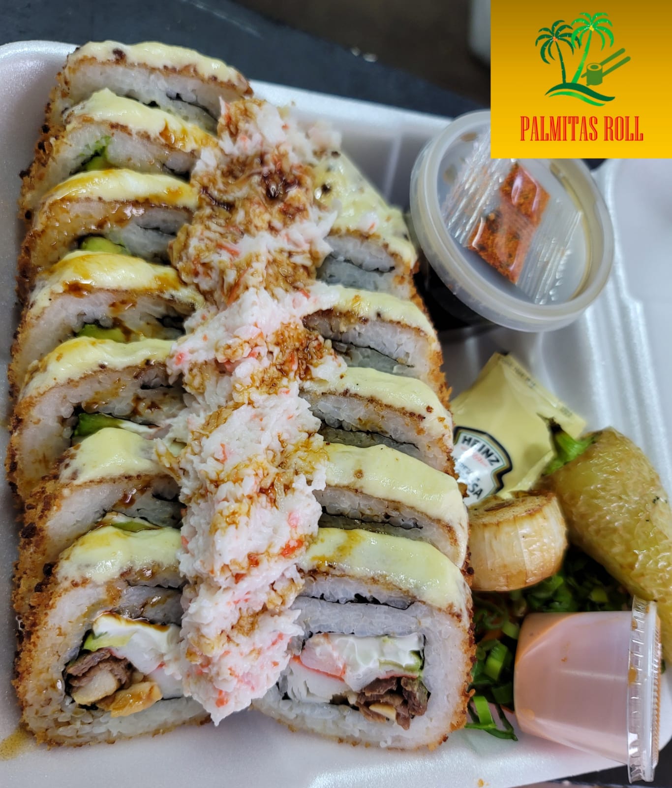 Por dentro: Res, pollo, camarón, cangrejo y gratinado, tampico y anguila por fuera.
