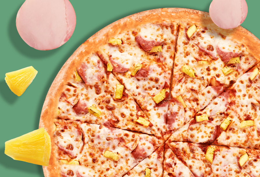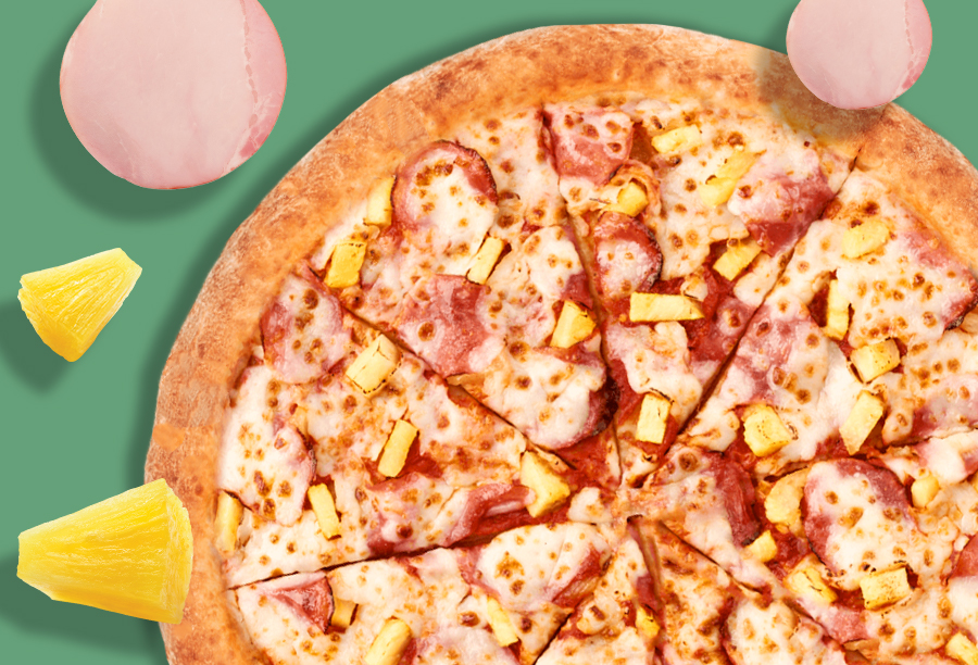 Pizza de jamón, piña y extra queso 100% Mozzarella.
