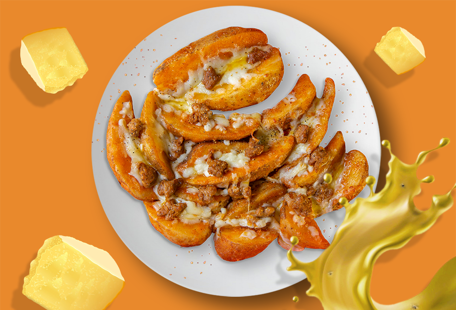 Potato Wedges con queso 100% Mozzarella , salchicha italiana, bañadas en salsa de Ajo y sazonador italiano.