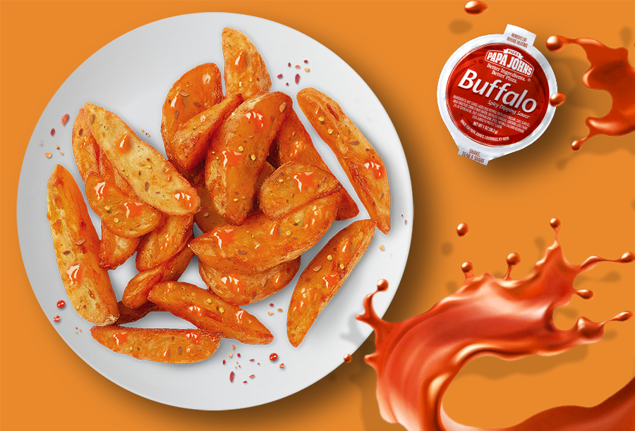 Potato Wedges bañadas en salsa Búfalo y chile quebrado, acompañadas de un dip de salsa Búfalo.