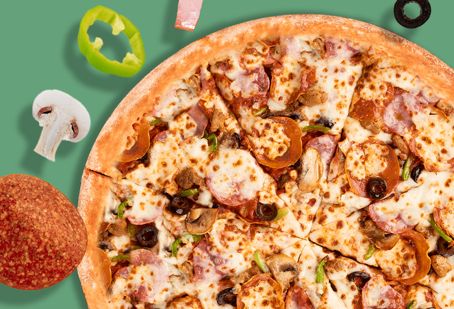 Pizza de pepperoni, salchicha italiana, jamón, champiñones, cebolla, pimiento verde y aceitunas negras.