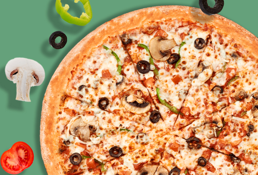 Pizza con vegetales frescos: champiñones, cebolla, pimiento verde, jitomate y aceitunas negras, en masa delgada New York de 14"