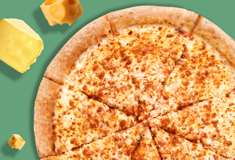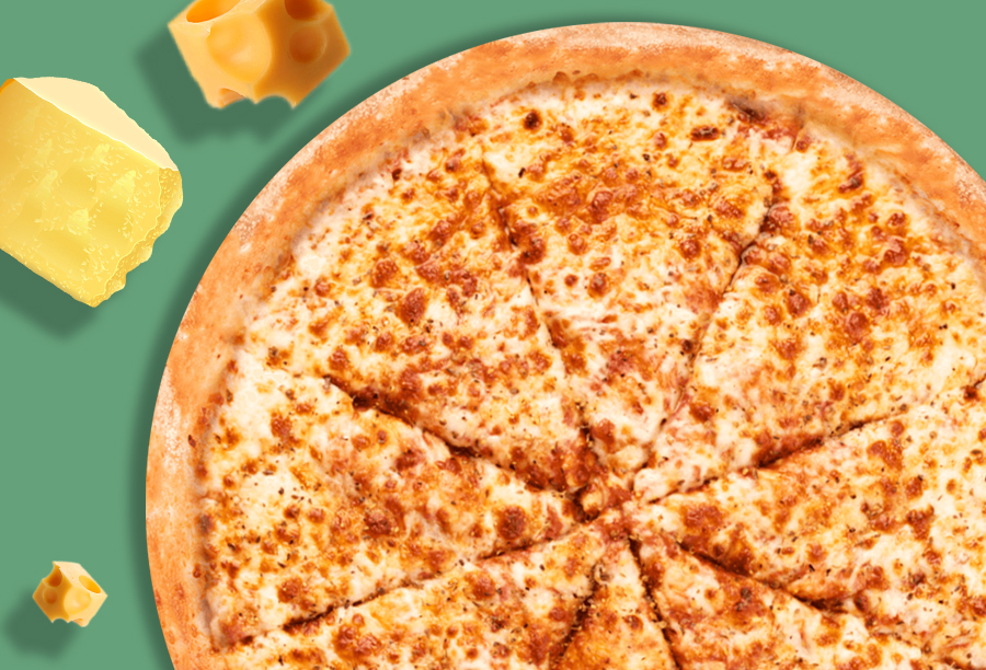 Pizza con mezcla de 6 quesos: Mozzarella, Parmesano, Romano, Asiago, Fontina, Provolone y hierbas italianas.