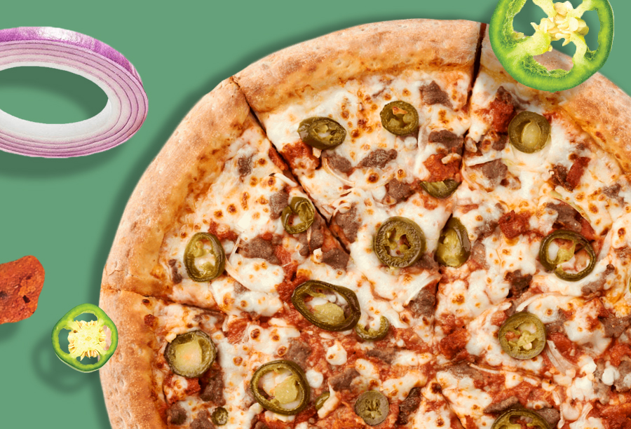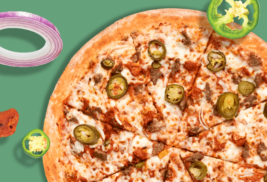 Pizza con chorizo, carne de res, cebolla, picositos jalapeños y salsa de tomate con frijoles.