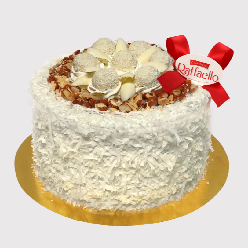 De vainilla, con betún y relleno de Philadelphia y Calahua, con coco húmedo, almendras horneadas y deliciosos chocolates Raffaello.