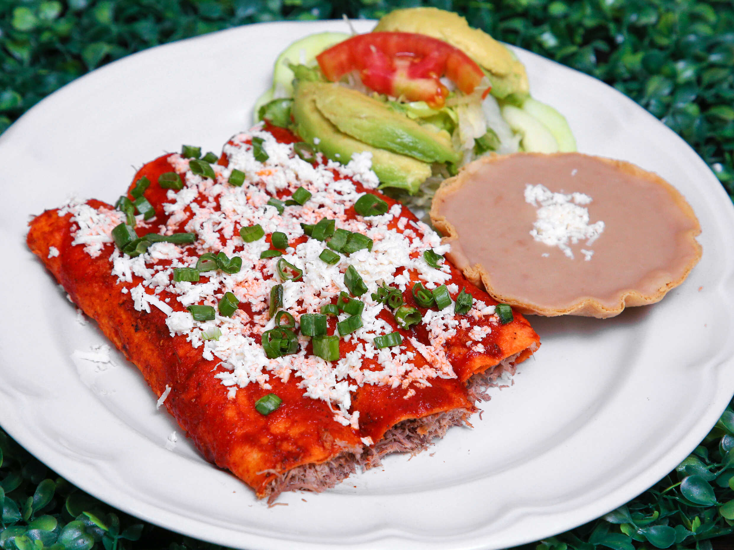 3 PIEZAS DE ECNHILADAS, RELLENAS DE RES DESHEBRADA, QUESO RAYADO , AGUACATE, ACOMPAÑADO DE FRIJOLES
