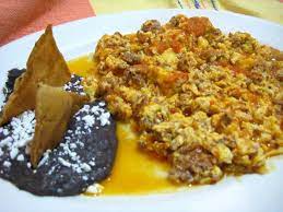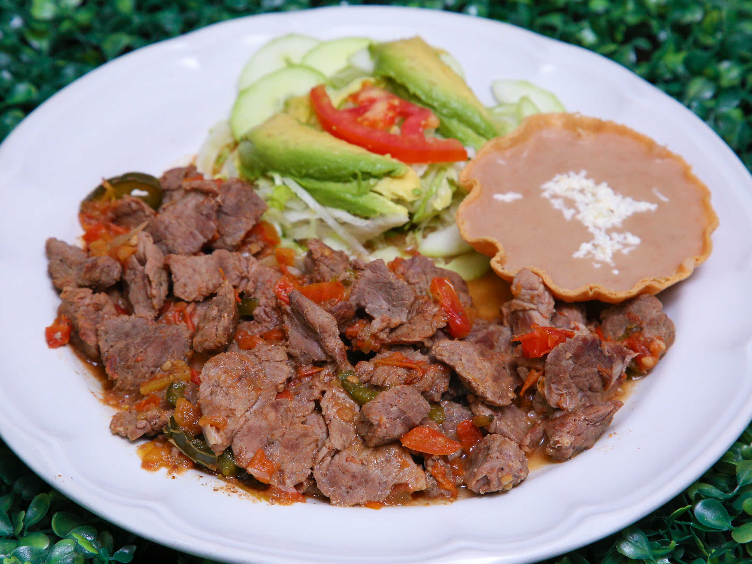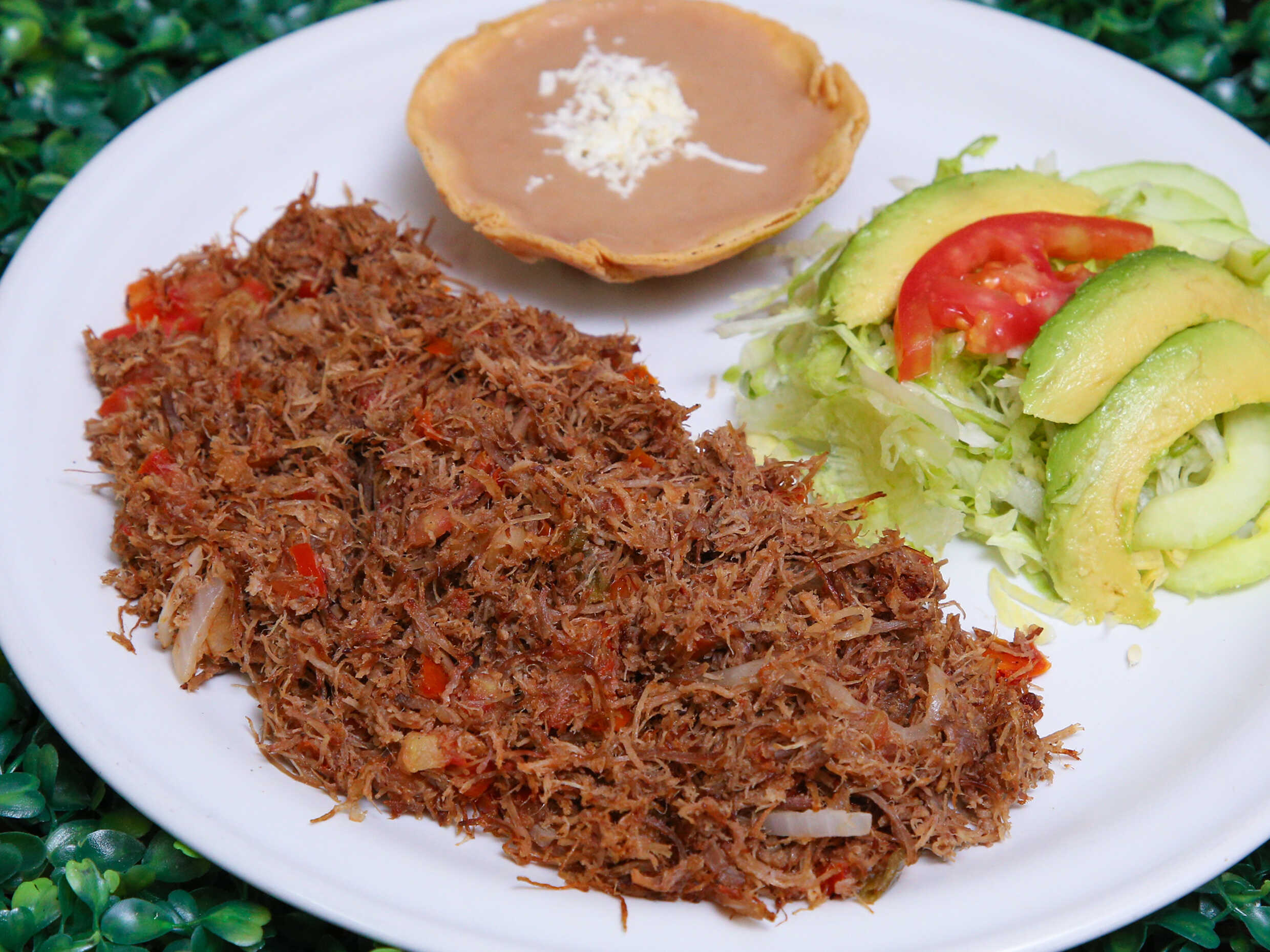 MACHACA GUISADA CON VERDURAS, ACOMPAÑADA DE FRIJOLES REFRITOS