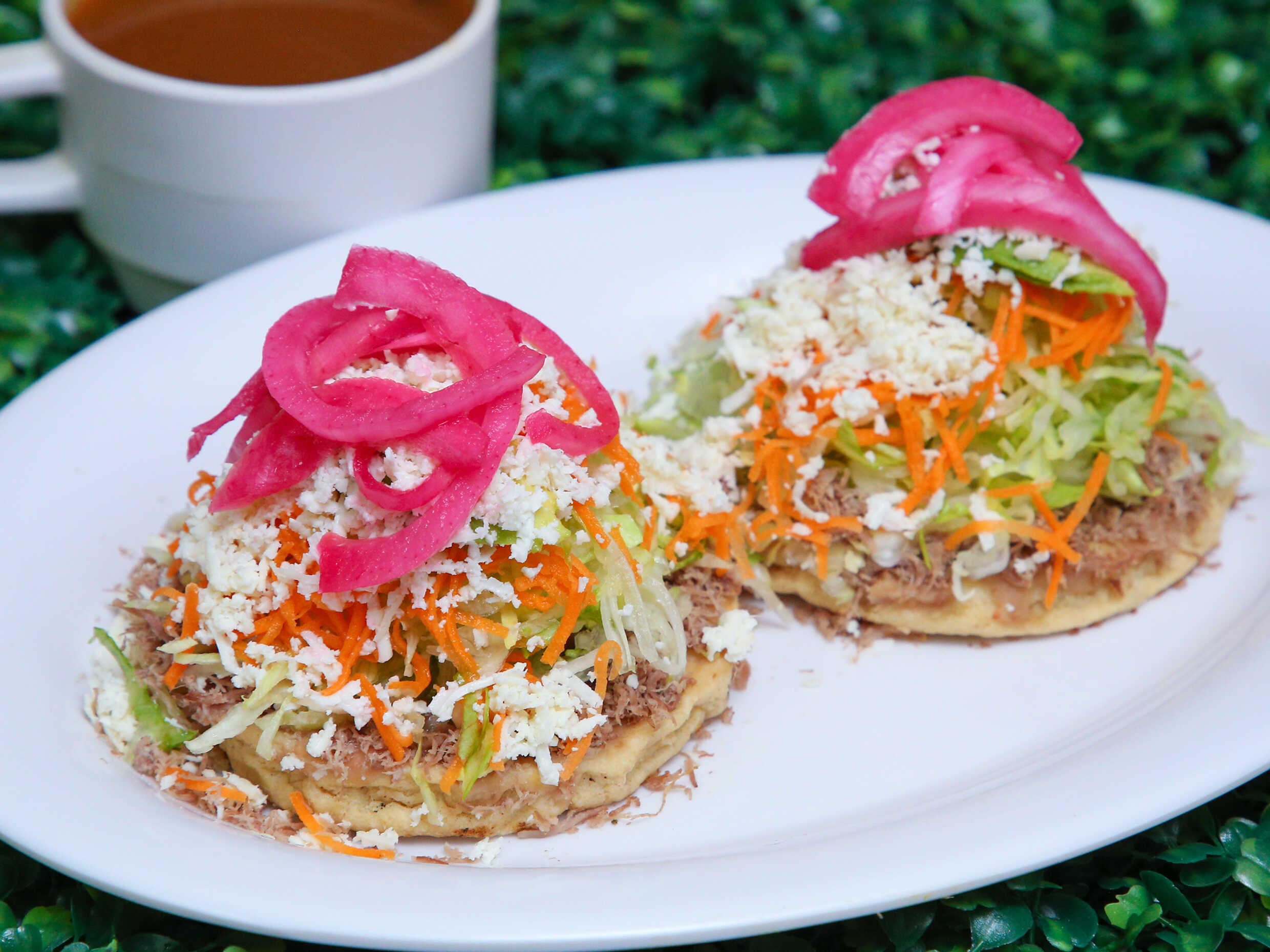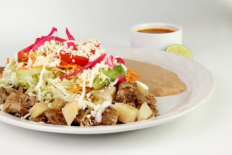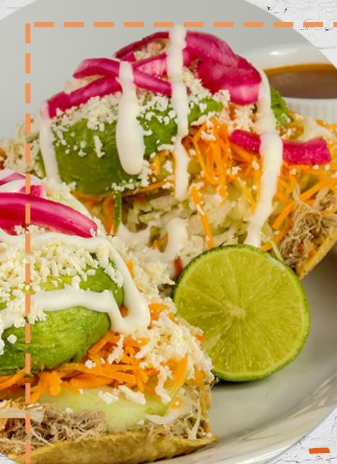 GORDITA CON FRIJOL, CARNE DE RES DEHEBRADA, LECHUGA, ZANAHORIA, PEPINO, AGUACATE, QUESO RAYADO ACOMPAÑADO DE CONSOME DE RES.
