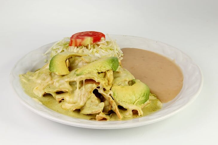 3 PIEZAS DE ENCHILADAS, RELLENAS DE POLLO DESHEBRADO, QUESO GRATINADO, ACOMPAÑADO DE FRIJOLES .