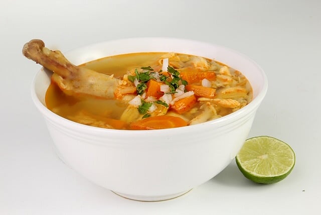 1 LITRO DE CONSOME DE POLLO, CUBOS DE ZANAHORIA, AROOZ Y PIEZAS DE POLLO