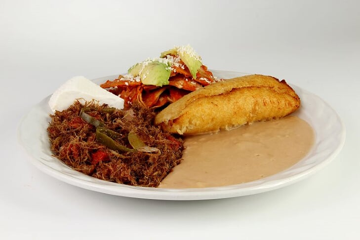 TAMAL FRITO, PORCION DE MACHACA GUISADA,CHILAQUILES A ELEGIR(SUIZOS,ROJOS,POBLANOS) ASADERA Y FRIJOLES