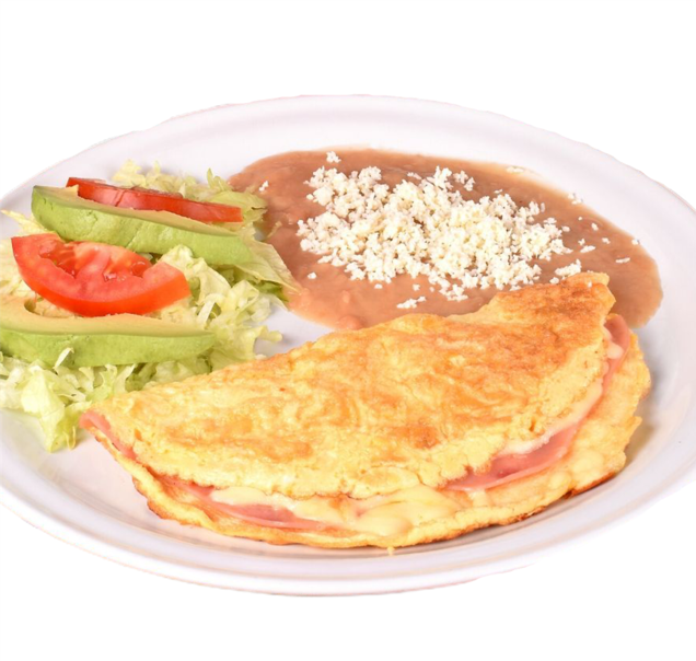2 HUEVOS EN OMELETTE RELLENO A ELEGIR: JAMON, CHAMPIÑON O VERDURA, CON SALSA A ELEGIR : SUIZO, ROJO, POBLANO, ACOMPAÑADA DE FRIJOLES REFRITOS.