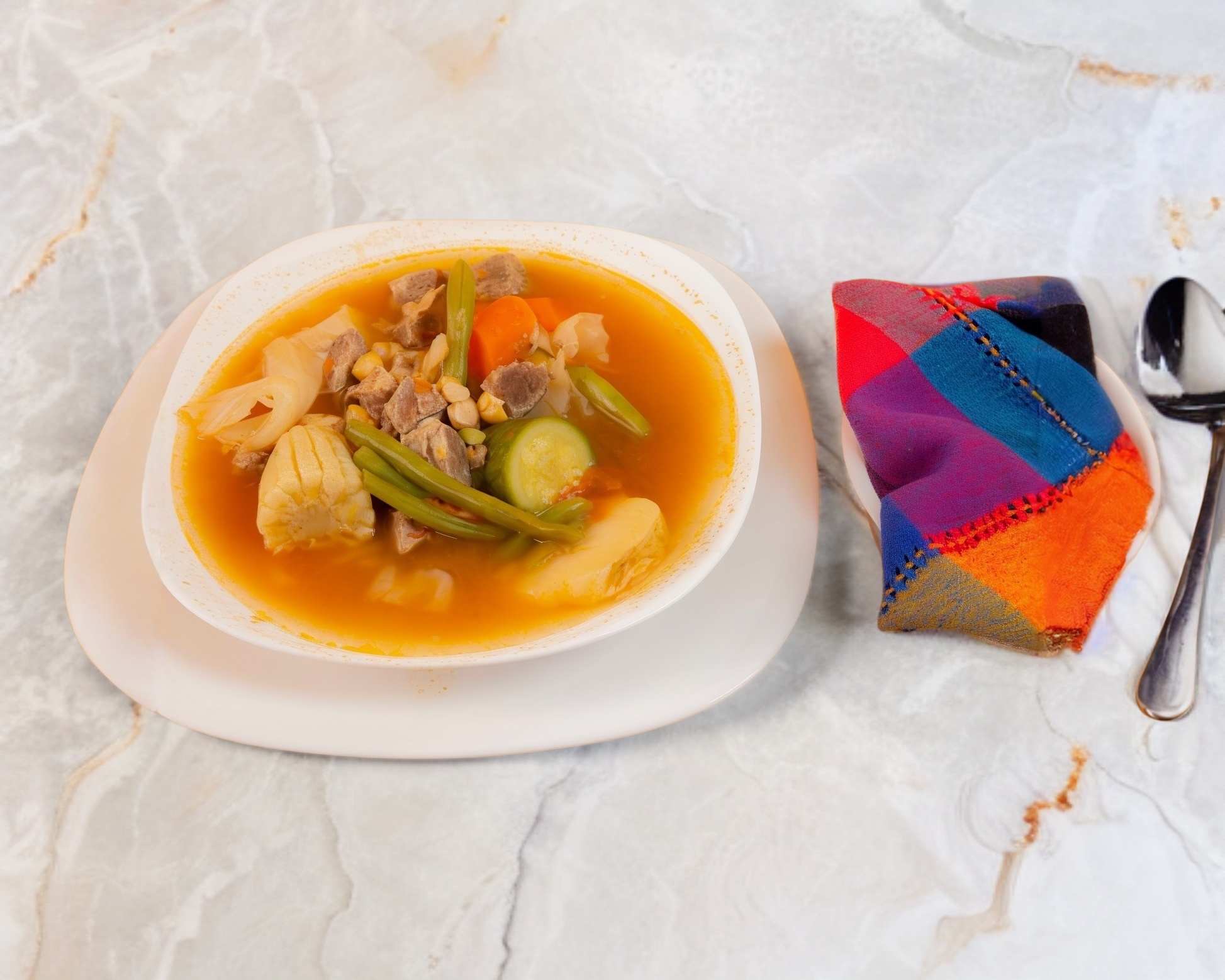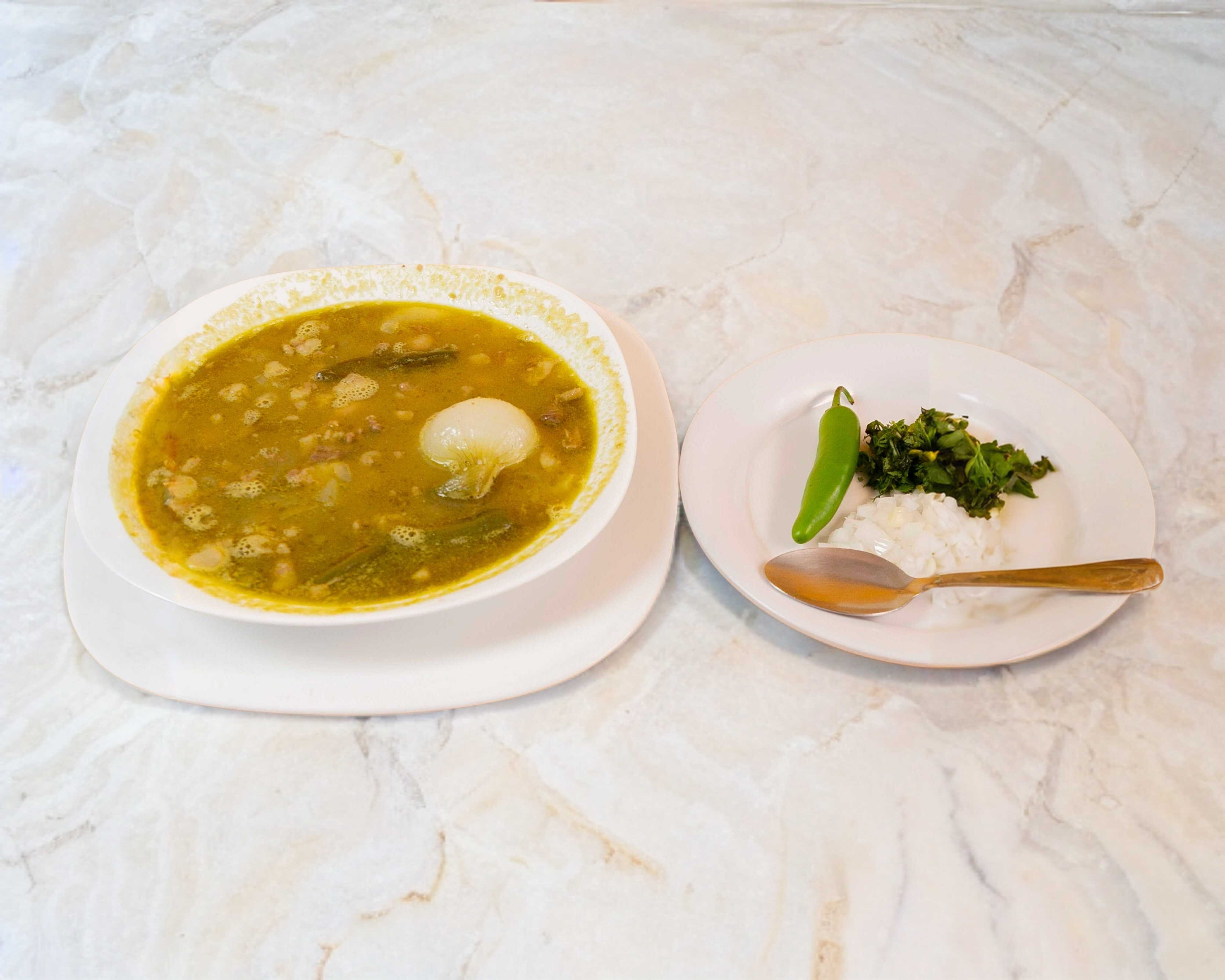 Cubos de carne de res con papas, cubiertos de verdura. Acompañados de frijol, aguacate, queso y consome.