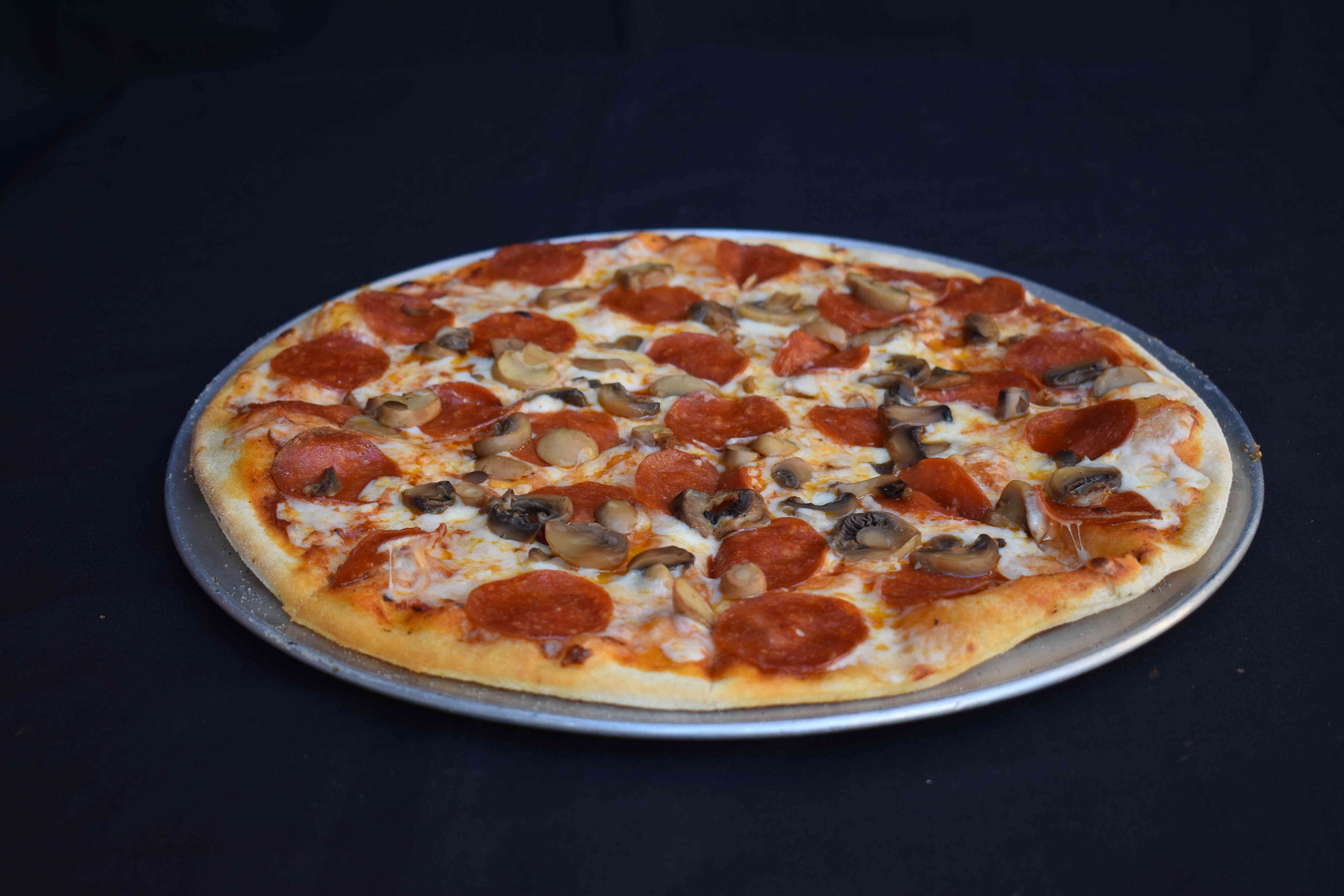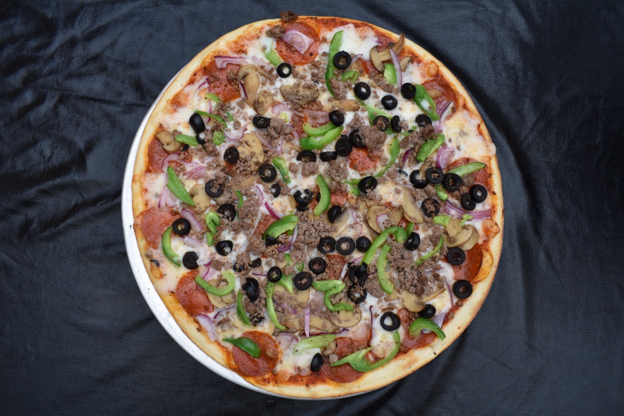 Carne molida, peperoni, champiñón, cebolla, pimiento verde y aceituna negra.