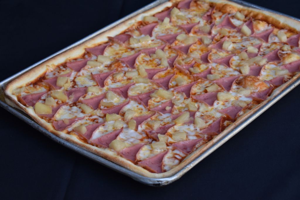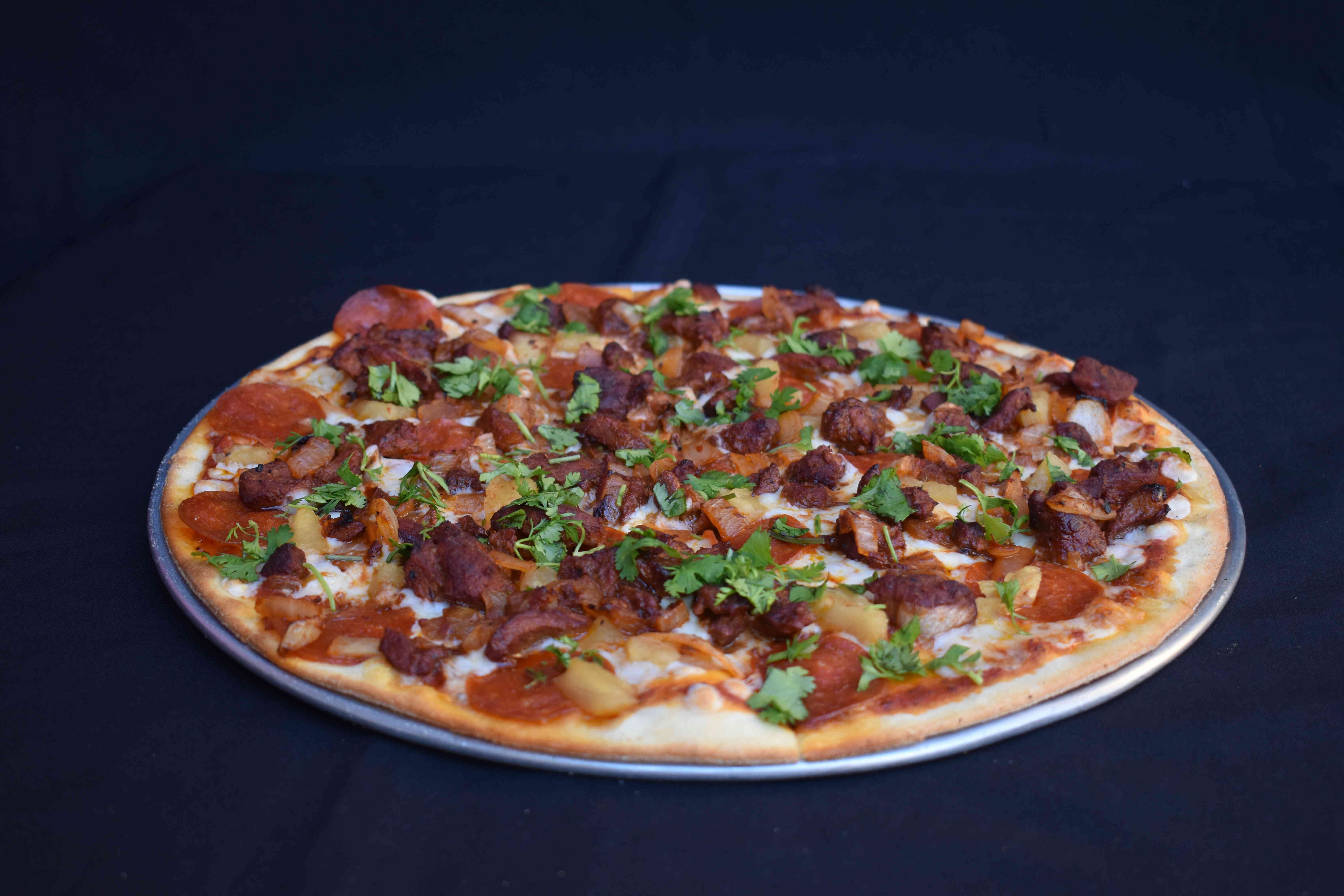 Carne adobada, peperoni, piña, cebolla asada y cilantro fresco.