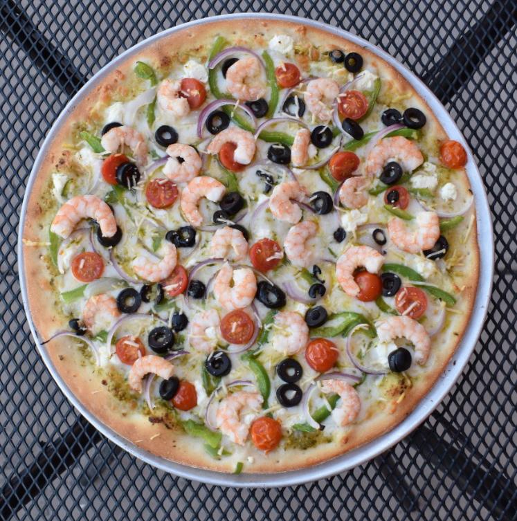 Camarón cocido, tocino, pimiento, cebolla morada, queso de cabra, tomate cherry con base de pesto de albahaca.