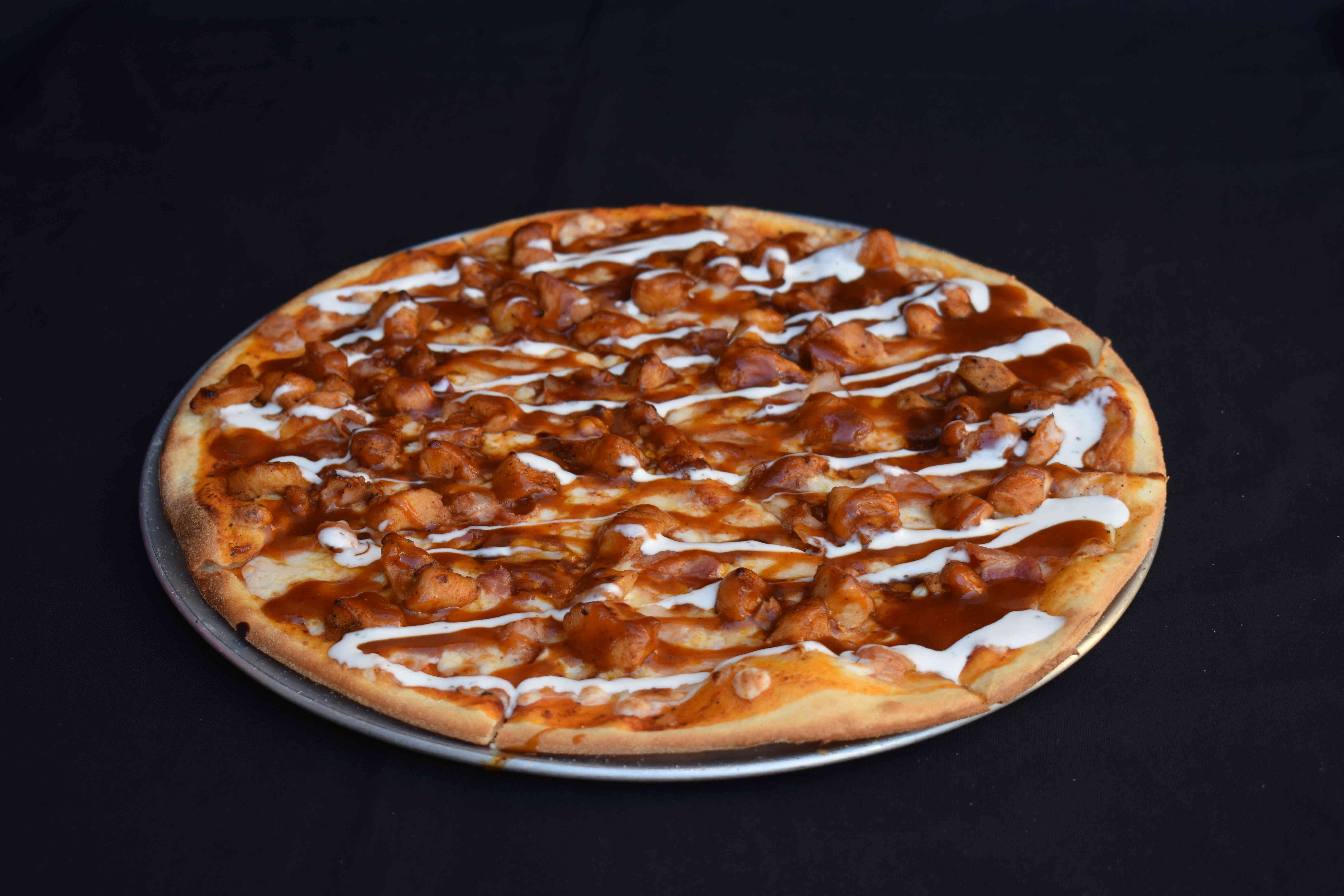 Pollo en salsa BBQ, tocino, queso de cabra.