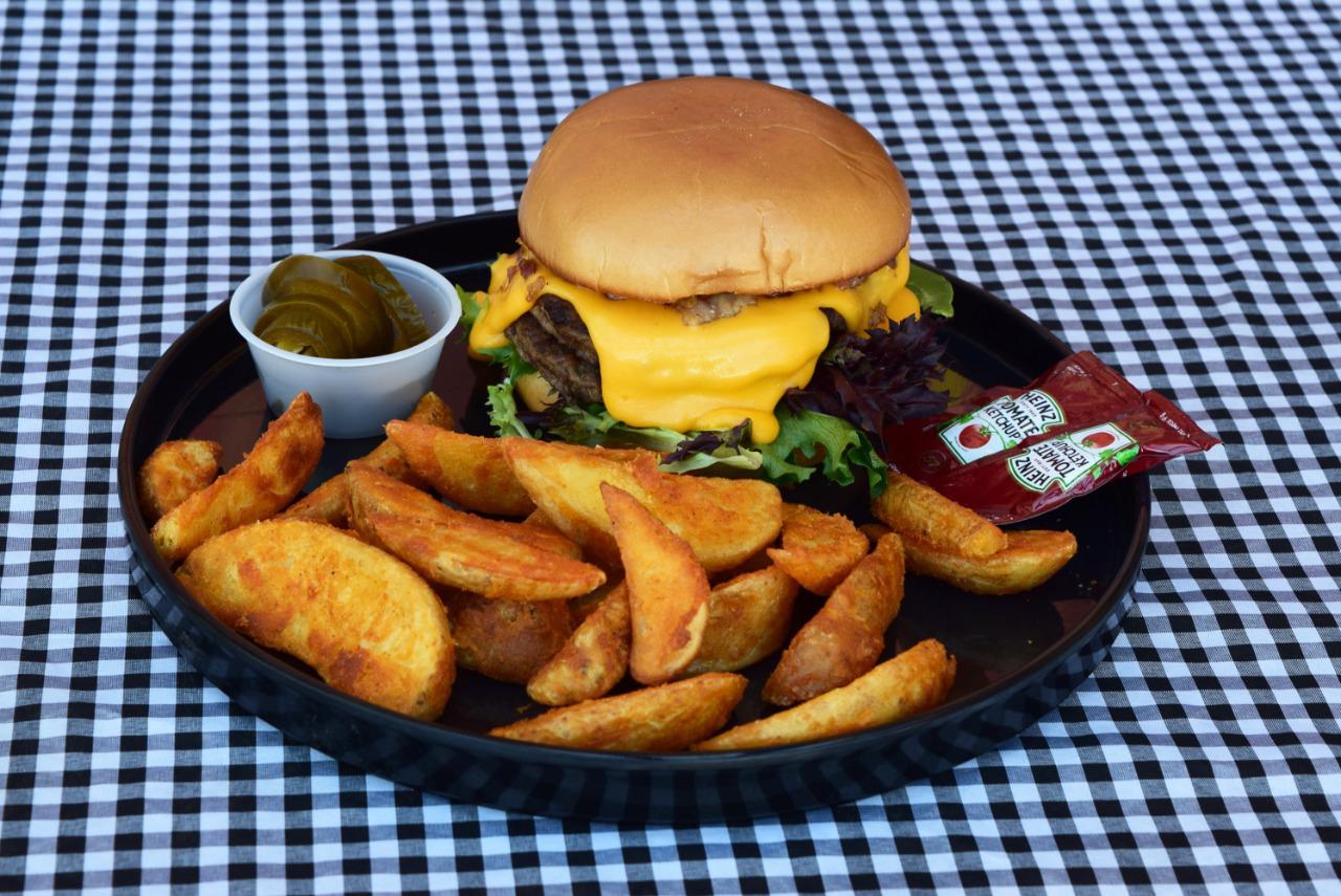 Doble Carne beef,lechuga,tocino,aguacate,gratinada con cheddar, acompañada con papas fritas.