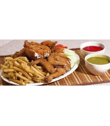 Paquete de pollo y medio acompañado de papas a la francesa, verdura, salsa y tortillas...