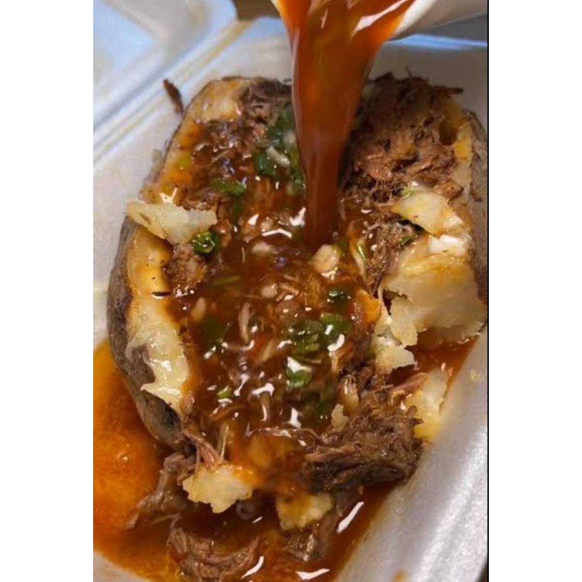 Deliciosa papa sincronizada con birria acompañada de un litro de caldo, salsas, cebolla, cilantro y tortillas hechas a mano.