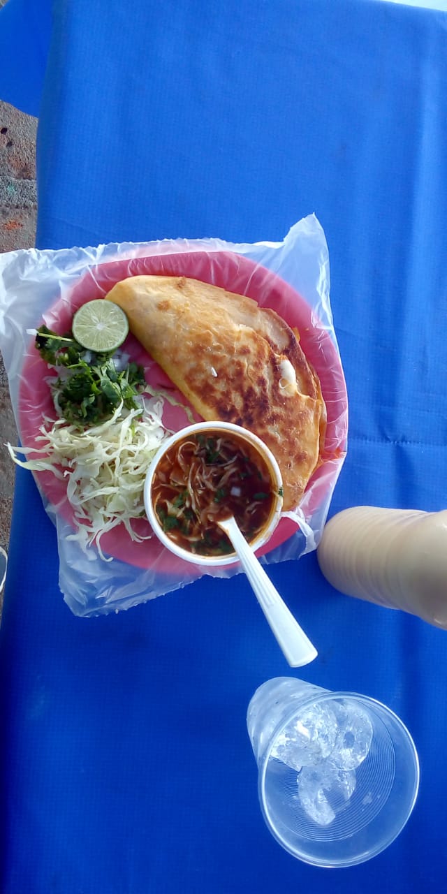 Una quesadilla mediana de maíz y agua fresca de 500 ml, acompañado de consomé..