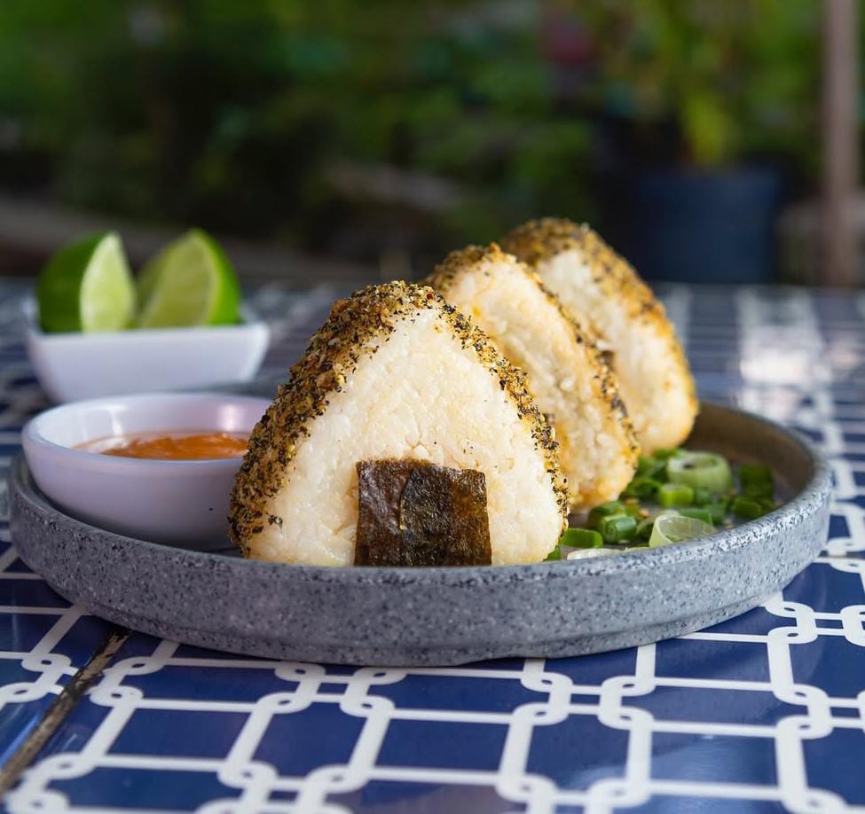 Tres bolitas de arroz rellenas de pollo curry envueltas en alga nori y furikake.