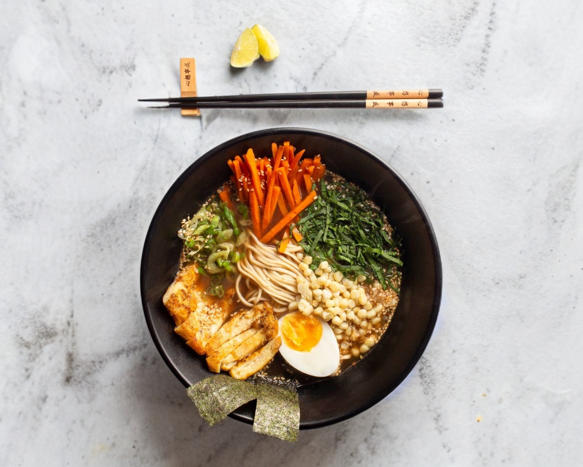 Delicioso ramen de lomo ahumado o pollo a la plancha zanahoria e ingredientes base.