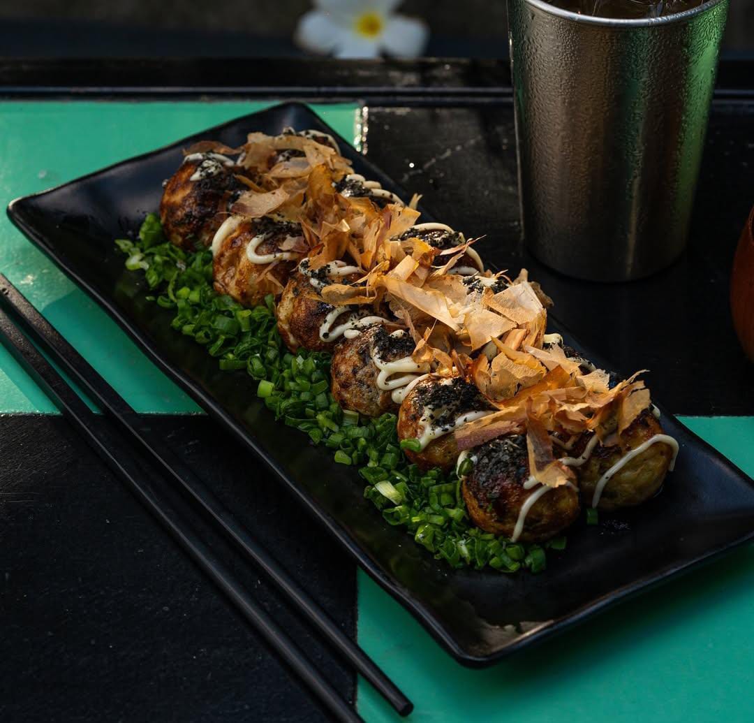 Bolitas de masa suaves, rellenas de pulpo o queso, con topping de bonito, algas, mayonesa y salsa, tonkatsu de la casa.